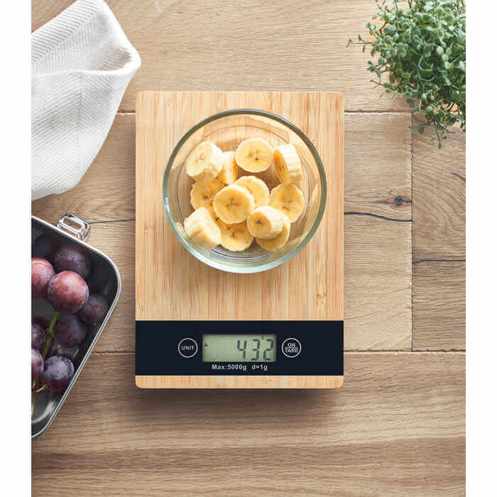 Digitální bambusová kuchyňská váha. Ideální pro vážení přísad a potravin v kuchyni, když pečete dort nebo vaříte chutná jídla. Váha má maximální kapacitu 5 kg. 2 baterie AAA nejsou součástí balení. Bambus je přírodní materiál, u jednotlivých položek se mohou mírně lišit barvy a velikosti, což může ovlivnit konečný výsledek dekorace.