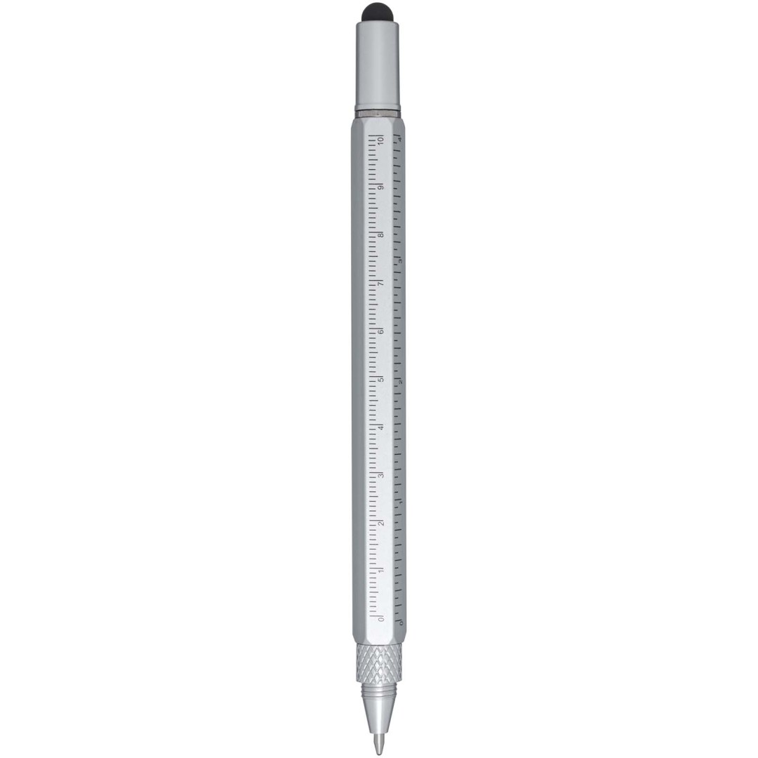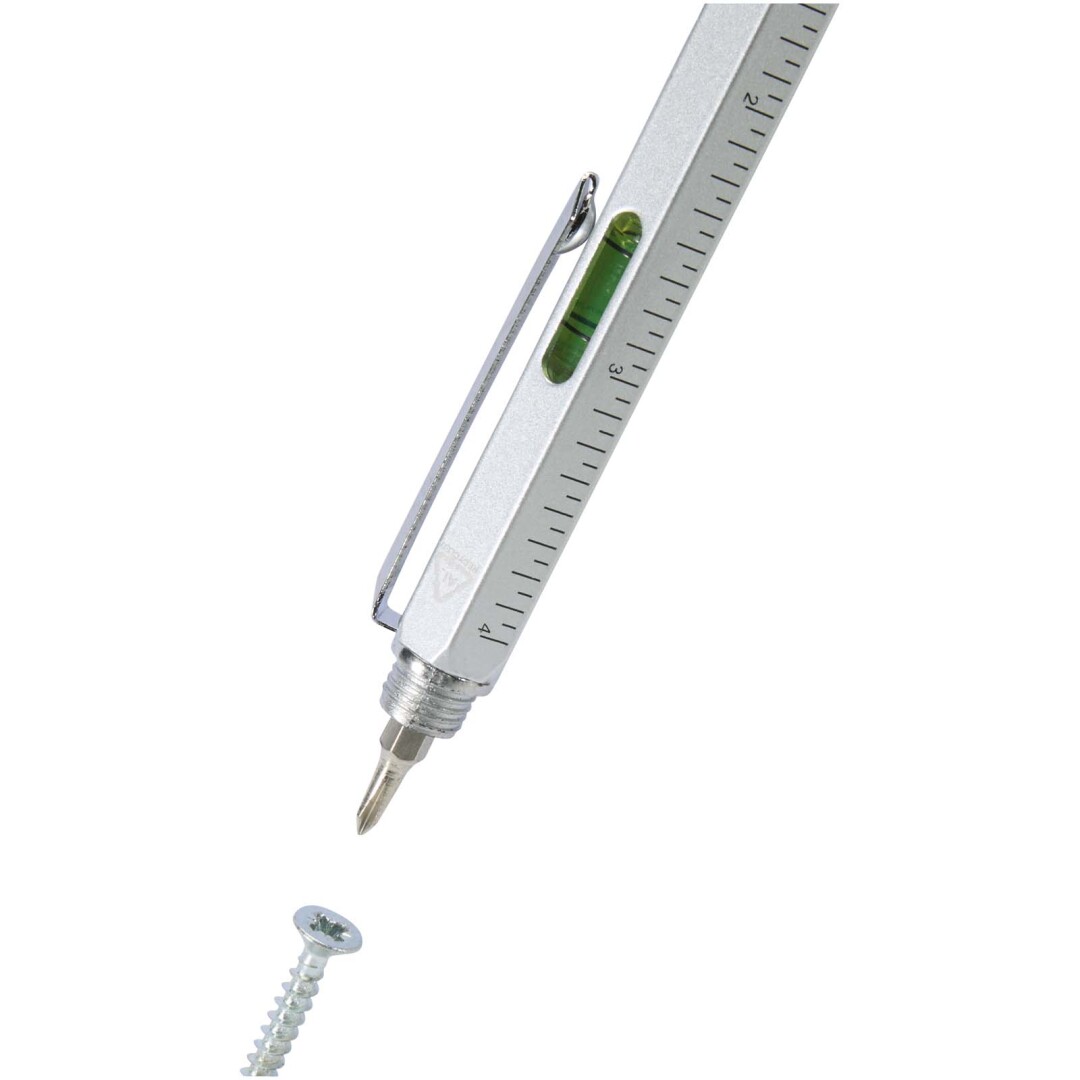 Hliníkové multifunkční kuličkové pero Dora je částečně vyrobeno z recyklovaných materiálů a je vybaveno oboustranným pravítkem, páčkou, šroubovákem, pomůckou pro měření úhlu sklonu a černým stylusem z gumy. Tělo je vyrobeno z recyklovaného hliníku se stříbrným nástřikem. Spona je vyrobena ze železa. Šroubovák je vyrobený z oceli. Horní část a špička jsou vyrobeny z materiálu RABS. Barva inkoustu: Černá. Délka psaní: 400 metrů. Rozměr hrotu: 1,0 mm.