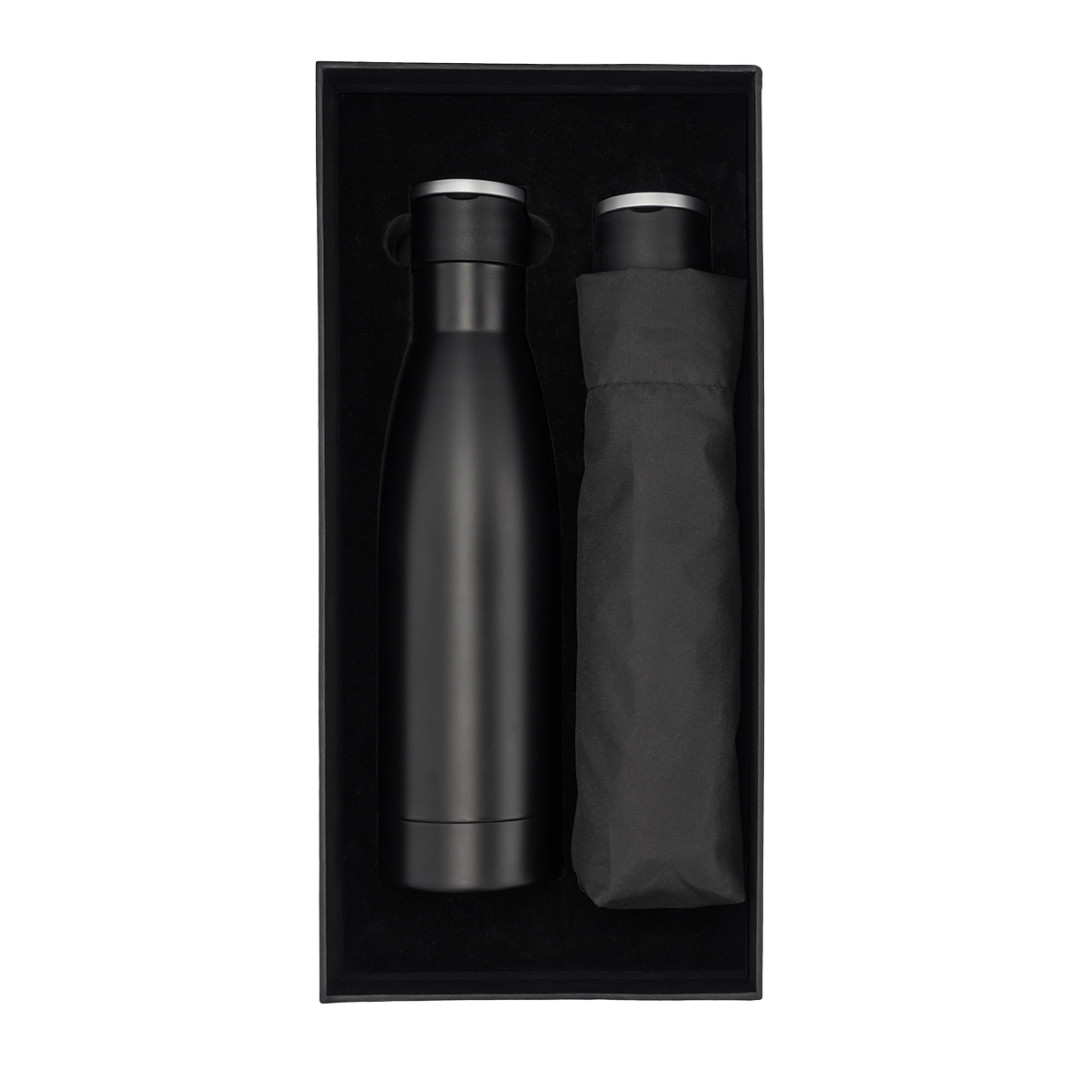 Dárková sada termosky a deštníku balená v elegantní černé krabičce. Termoska o objemu 500 ml s dvojitou stěnou z nerezové oceli, vnitřní stěnou z vylepšené oceli 18/8 a skládací rukojetí. Deštník ve voděodolném obalu vyrobený z RPET pongee 190T, žebra deštníku vyrobená ze sklolaminátu.