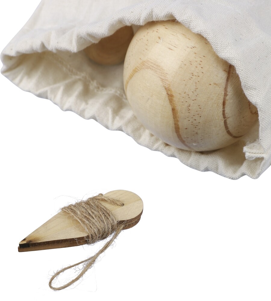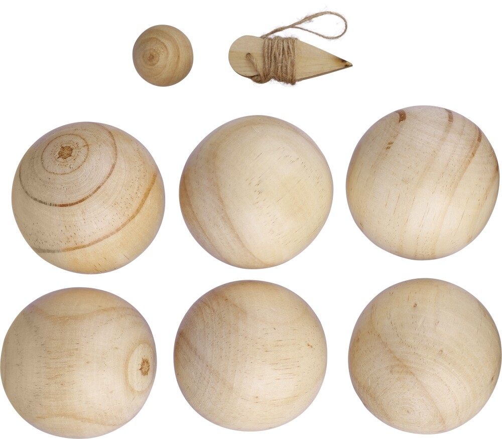Dřevěná hra, obsahující 6 míčů (každý 7 cm) a 1 menší míč (2 cm). Dodává se s provazem a je zabalen jako sada v bavlněném pouzdře se stahovací šňůrkou. Vhodné pro 4-6 hráčů a ideální pro aktivity založené na agility. Rozměry: 30 x 20 cm