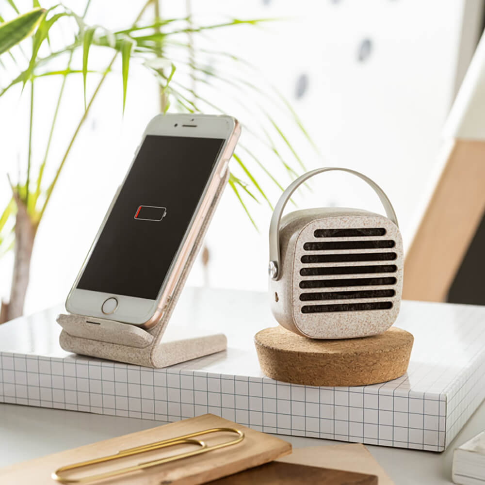 Pšeničné slaměné vlákno a držák mobilního telefonu ABS s bezdrátovou nabíječkou. S rychlým nabíjecím výkonem 10 W a se vstupy 5V / 2A a 9V / 1.67. Obsahuje 1 m micro USB nabíjecí kabel. Dodávané v krabičce ze sulfátu. 70 x 112 x 87 mm