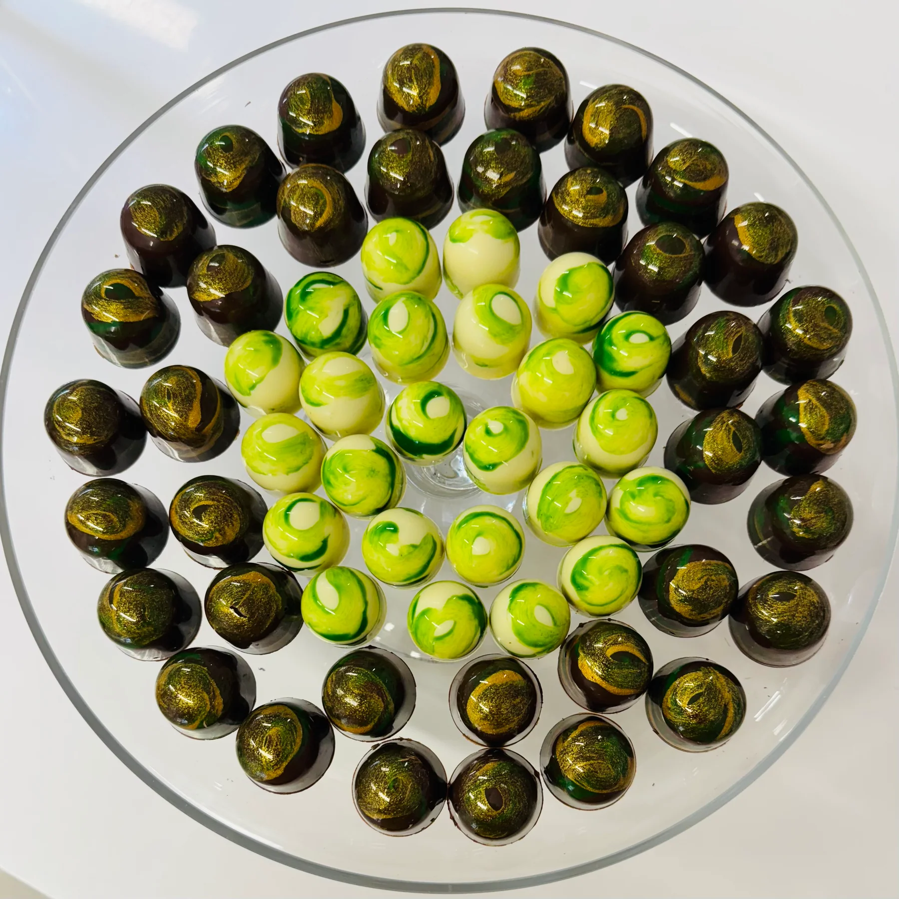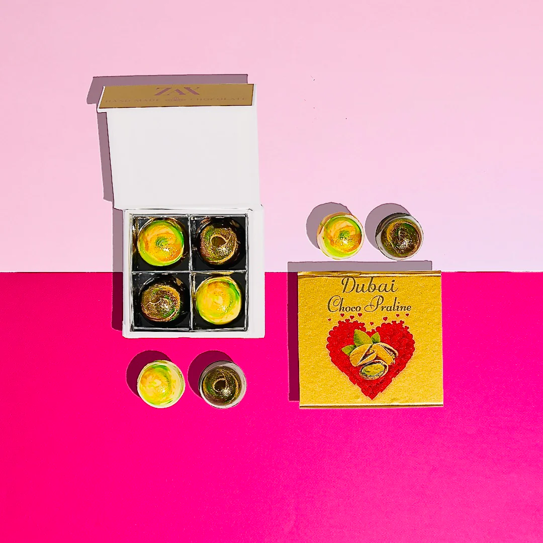 DUBAI Choco Praline je exkluzivní kolekce 2+2 ručně malovaných pralinek se 100% pistáciovou pastou, tahini a jemným kadayifem, které vytvářejí orientální harmonii chutí. Prémiová bílá a mléčná čokoláda, křupavá i krémová textura a luxusní balení s magnetickým zavíráním udělají z této bonboniéry skutečný zážitek. Dopřejte si kousek dubajského luxusu a podělte se o jedinečný okamžik s partnerem. Trvanlivost: 6 týdnů. Rozměr: 80×74×40 mm. Váha: 50 g