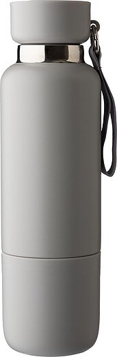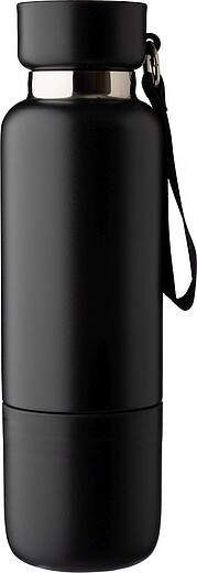 Nerezová vakuová dvouplášťová láhev na pití s PP šálkem na pití (300 ml) na dně. Uvnitř je nerezová ocel 304, vnější nerez 201. PP víko s průhledným uzávěrem AS, s polyesterovou šňůrkou na zápěstí a popruhem na přenášení. Matné barvy. Jednotlivě baleno v hnědé kartonové krabici. Materiál: nerezová ocel. Rozměry: 7,5 x 25,8 cm