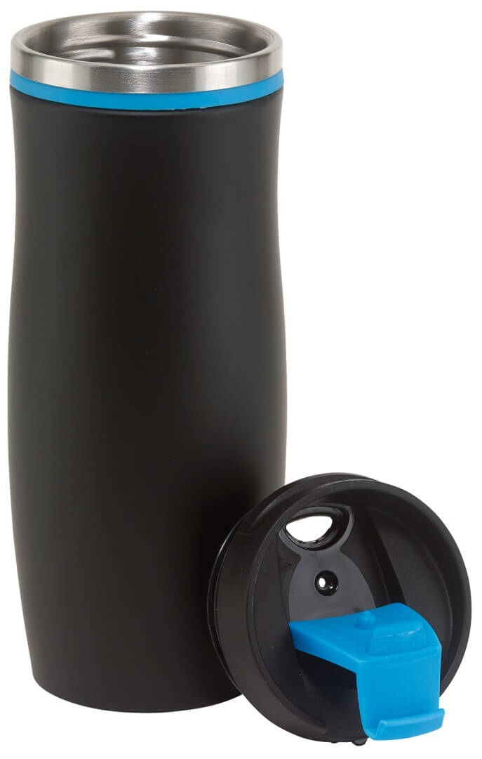 Dvoustěnný cestovní hrnek DARK CREMA: vnitřní a vnější část vyrobená z nerezové oceli, plastové víko s bezpečným šroubovacím uzávěrem a integrovaným rozkládacím otvorem na pití, barevný gumový prstenec na horne straně a pogumovaná dolní část pro dobrou povrchovou adhezi, kapacita cca. 400 ml