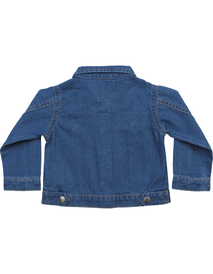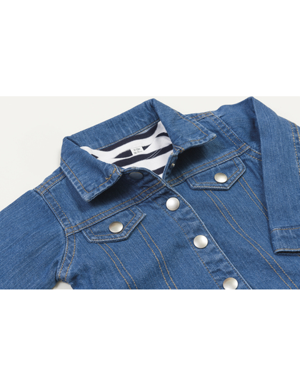 Organická bavlna nebo přechod na organickou bavlnu | Denim 9oz | 2 náprsní kapsy s chlopněmi na patentky | 5 patentek bez niklu vpředu | Prošívání v džínovém stylu | Nezdobený zadní díl | Patentky na manžetách | Poutka s patentkami na zadním lemu | Postranní švy.