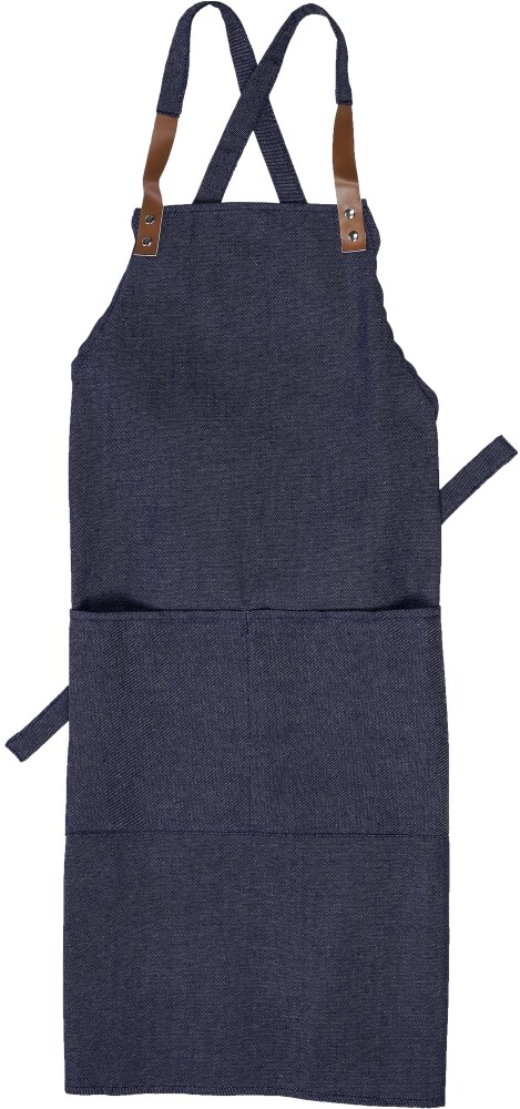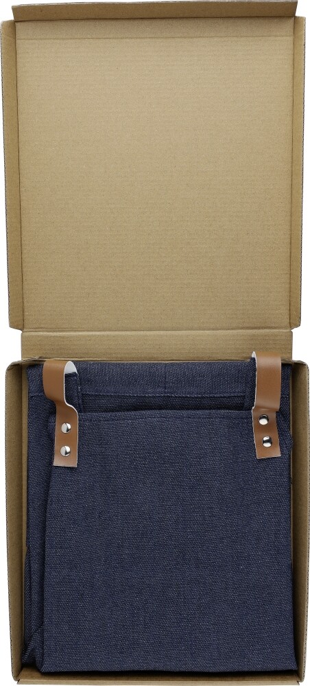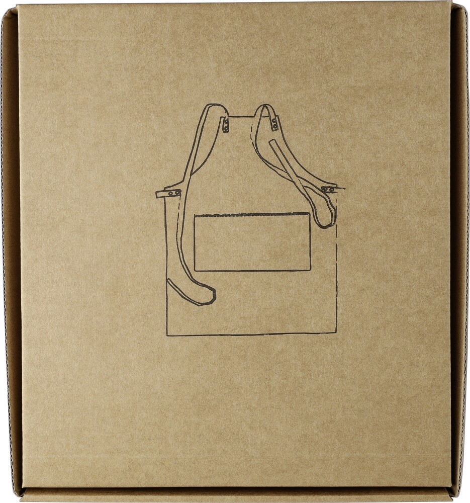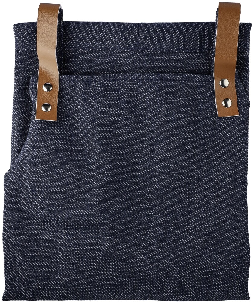 Denim (280 g/m²) zástěra s ramínky na ramena a dvěma předními kapsami. Denim látka je vyrobena z 65% polyesteru a 35% bavlny. Tato zástěra nemá ramínka na krk, pouze ramínka na ramena. Stálobarevnost džínoviny je do 2 – 3 úrovní. Jednotlivě baleno v hnědé kartonové dárkové krabičce. Rozměry: 68 x 88 x 88 cm
