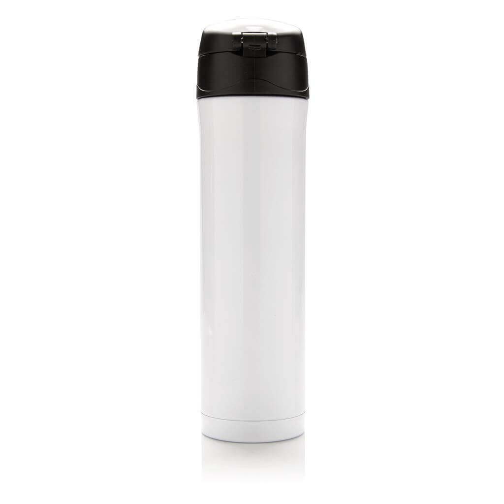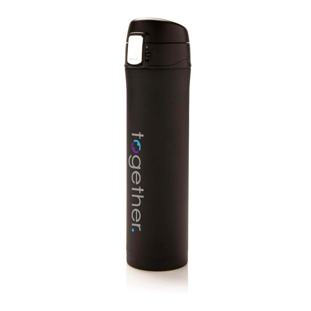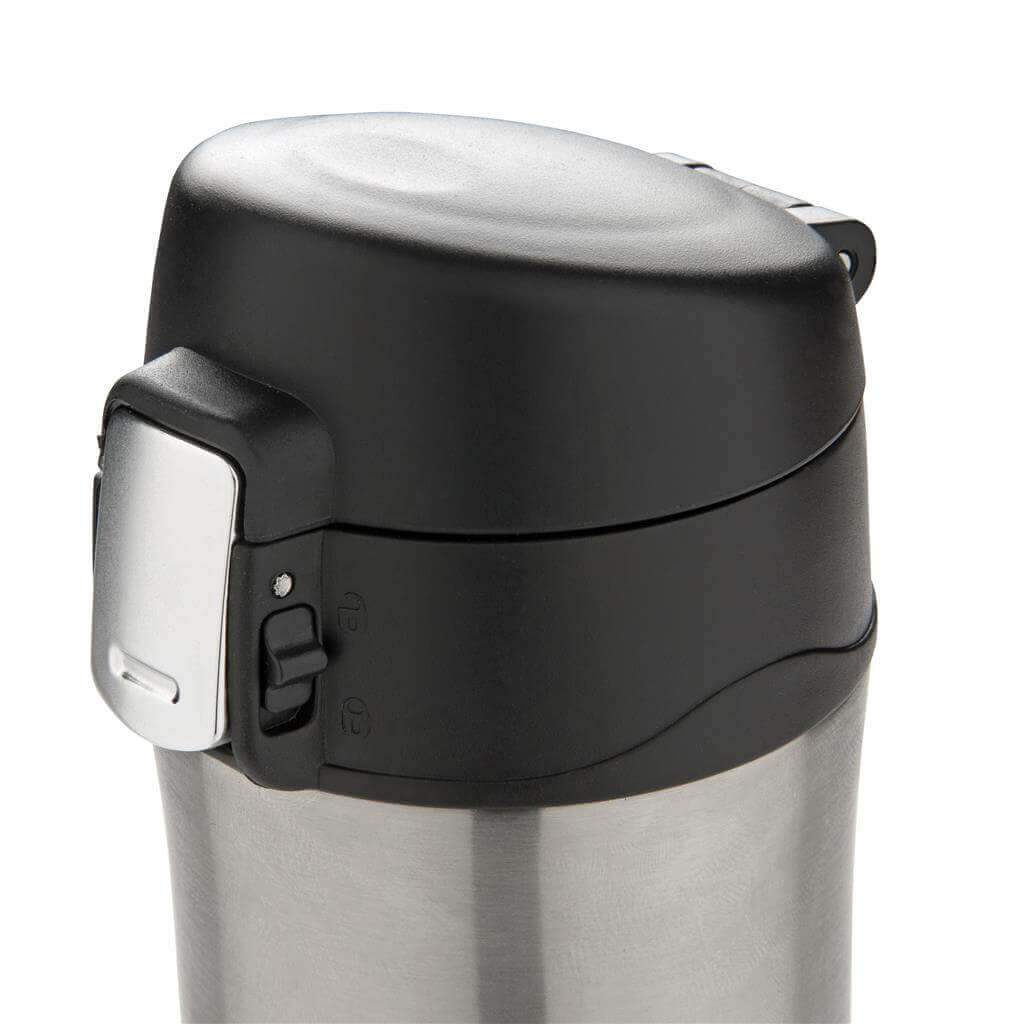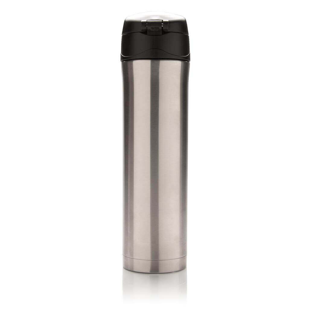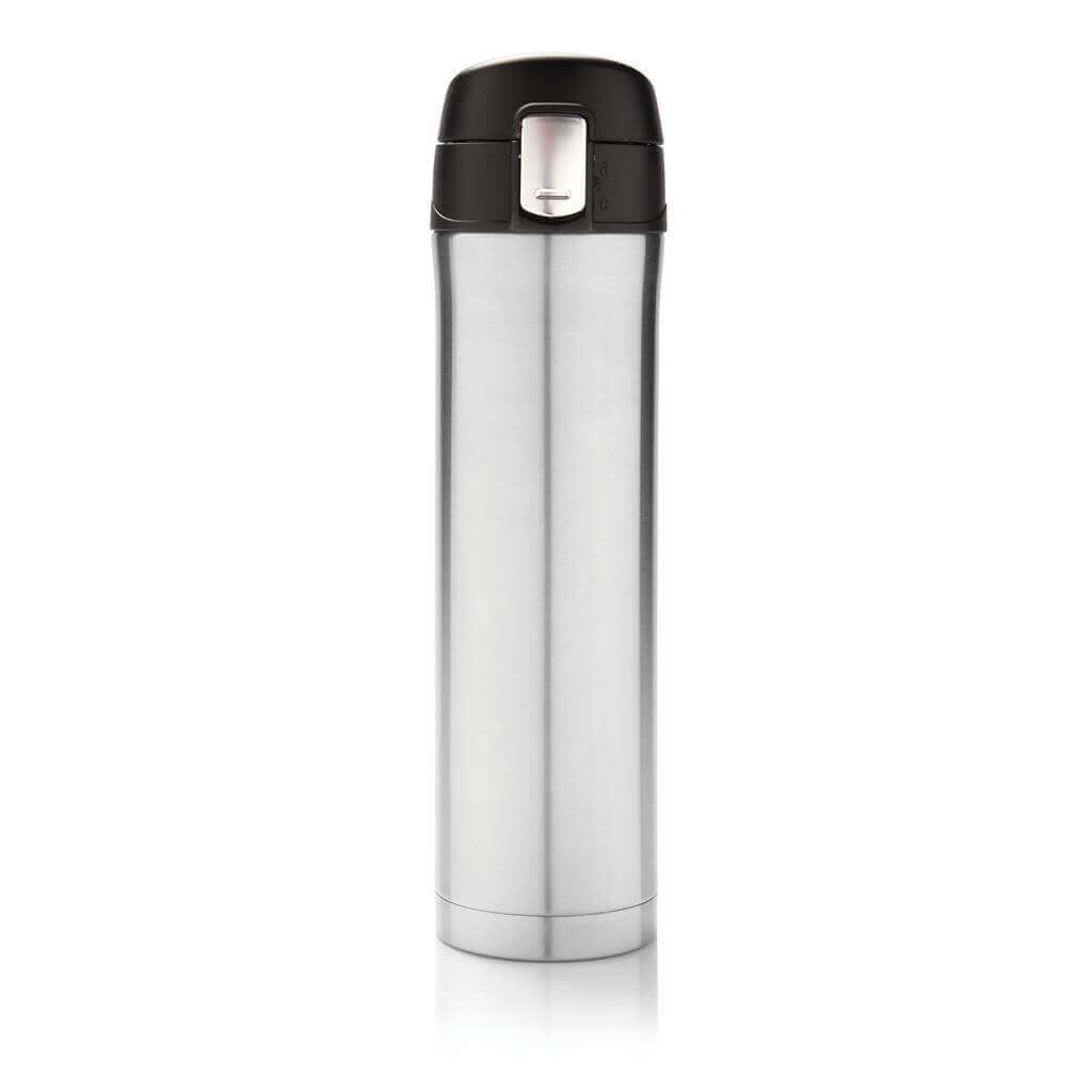 Termoska z nerez oceli s dvojitou stěnou udrží vaše nápoje teplé až po dobu 5 hodin nebo chladné po dobu 15 hodin. Uzávěr lze uzavřít a uzamknout pro zabránění vylití tekutiny. Uzávěr je uzpůsoben pro snadné čištění a mytí i v myčce. Jedinečný design termosky umožňuje pohodlné a bezpečné uchopení a ovládání otevírání jednou rukou. Díky své velikosti se termoska hodí do všech držáků nápojů do auta. Objem: 450 ml. PMS color 1: 288C, PMS color 2: Black PMS color 1: Black, PMS color 2: Black PMS color 1: 428, PMS color 2: Black PMS color 1: White, PMS color 2: Black PMS color 1: 186, PMS color 2: Black