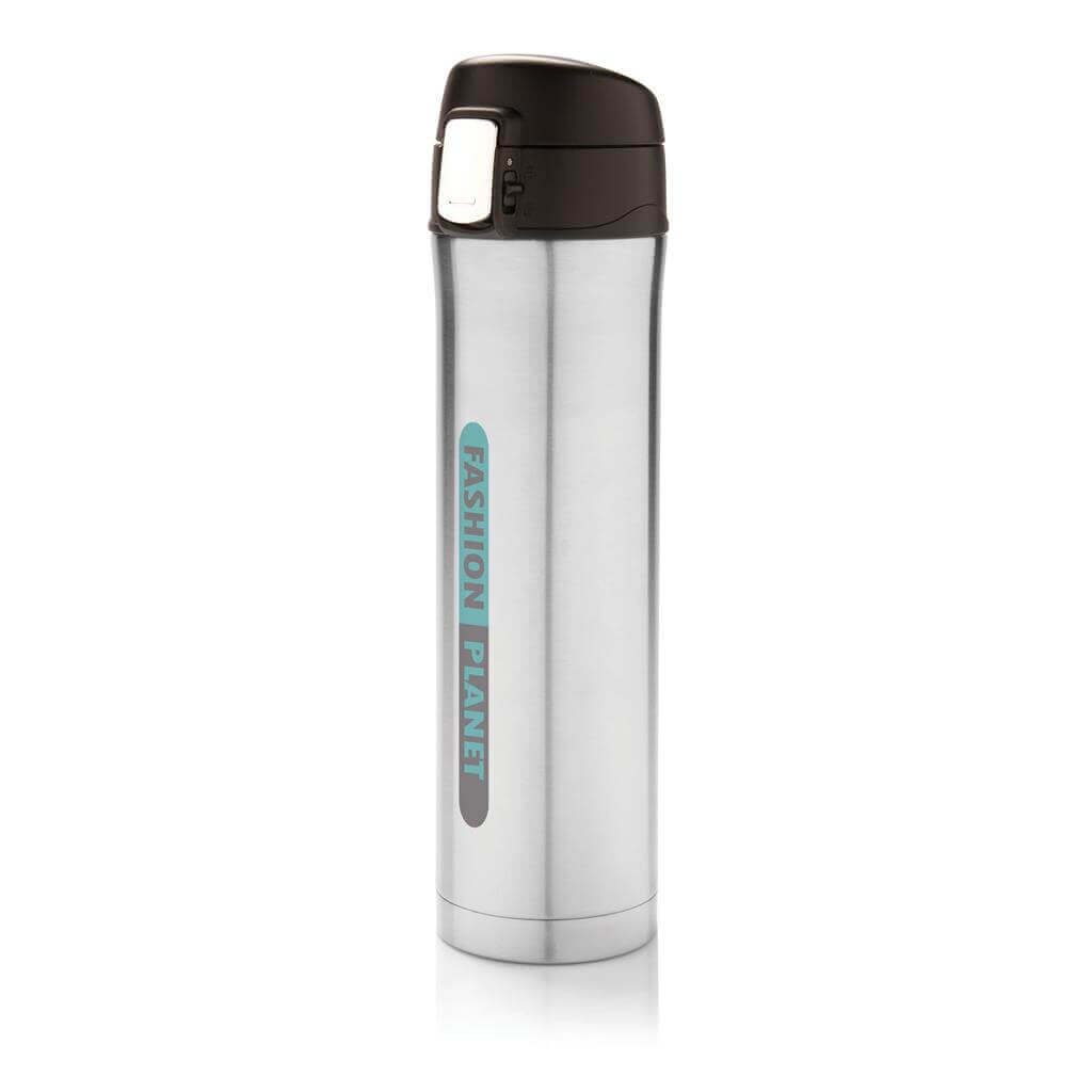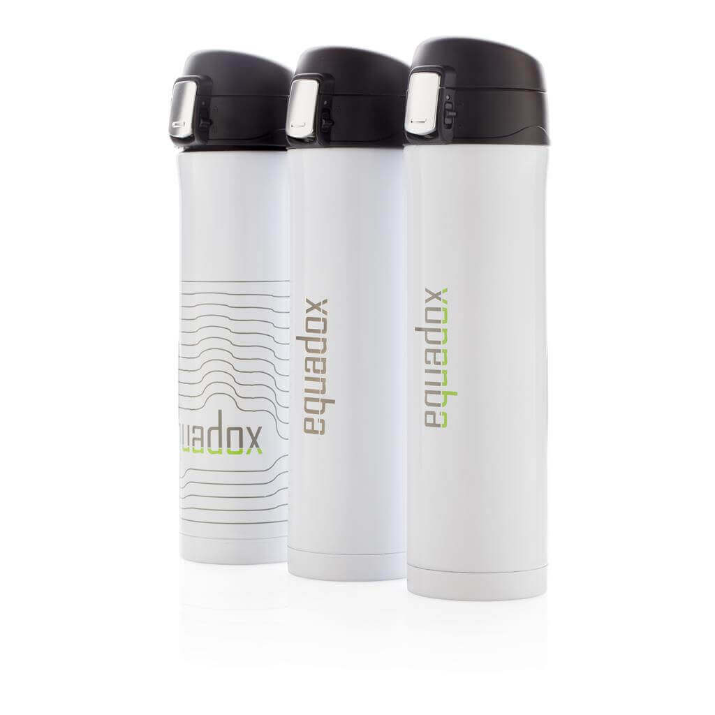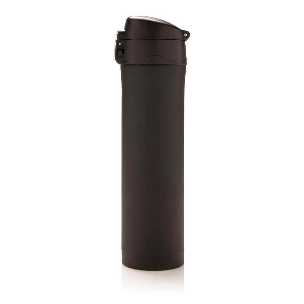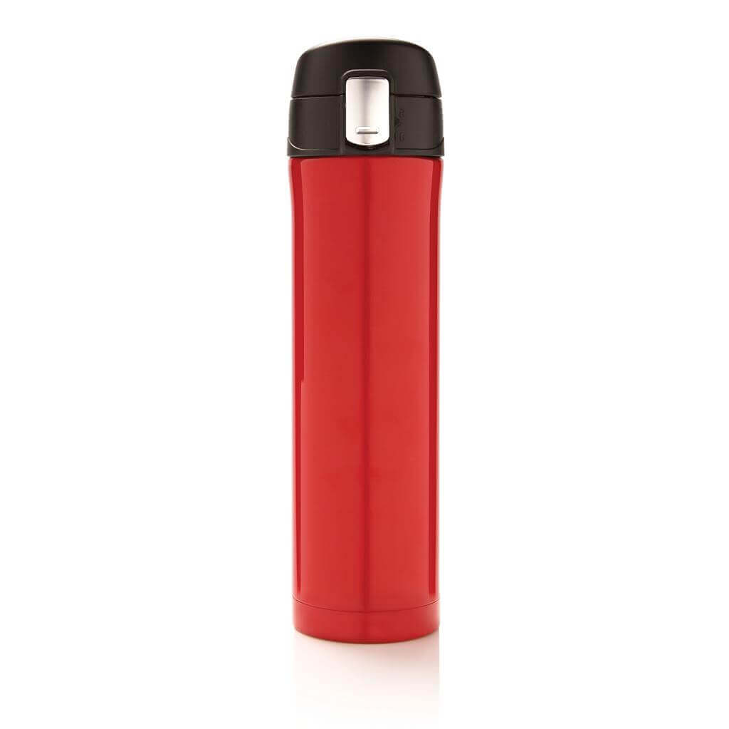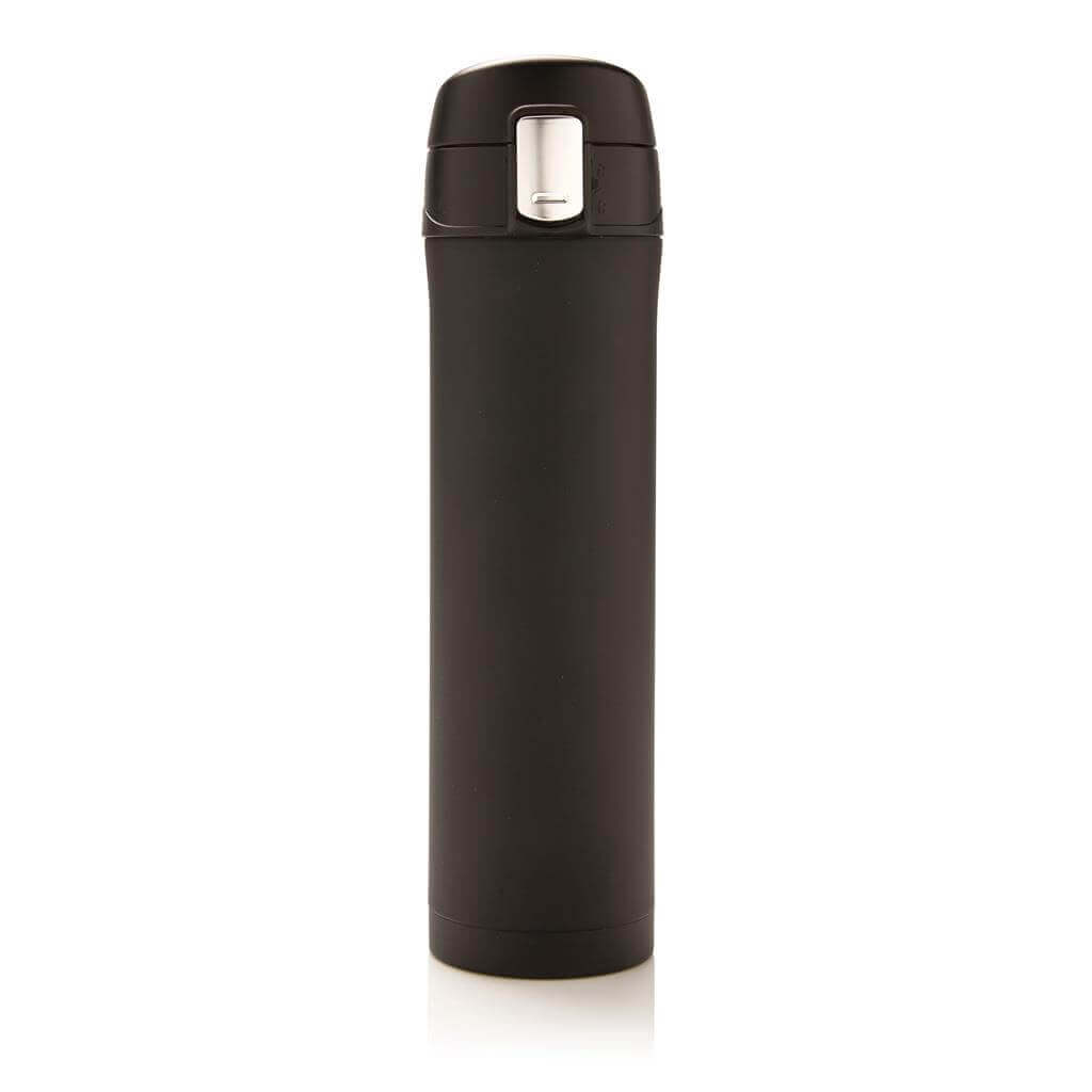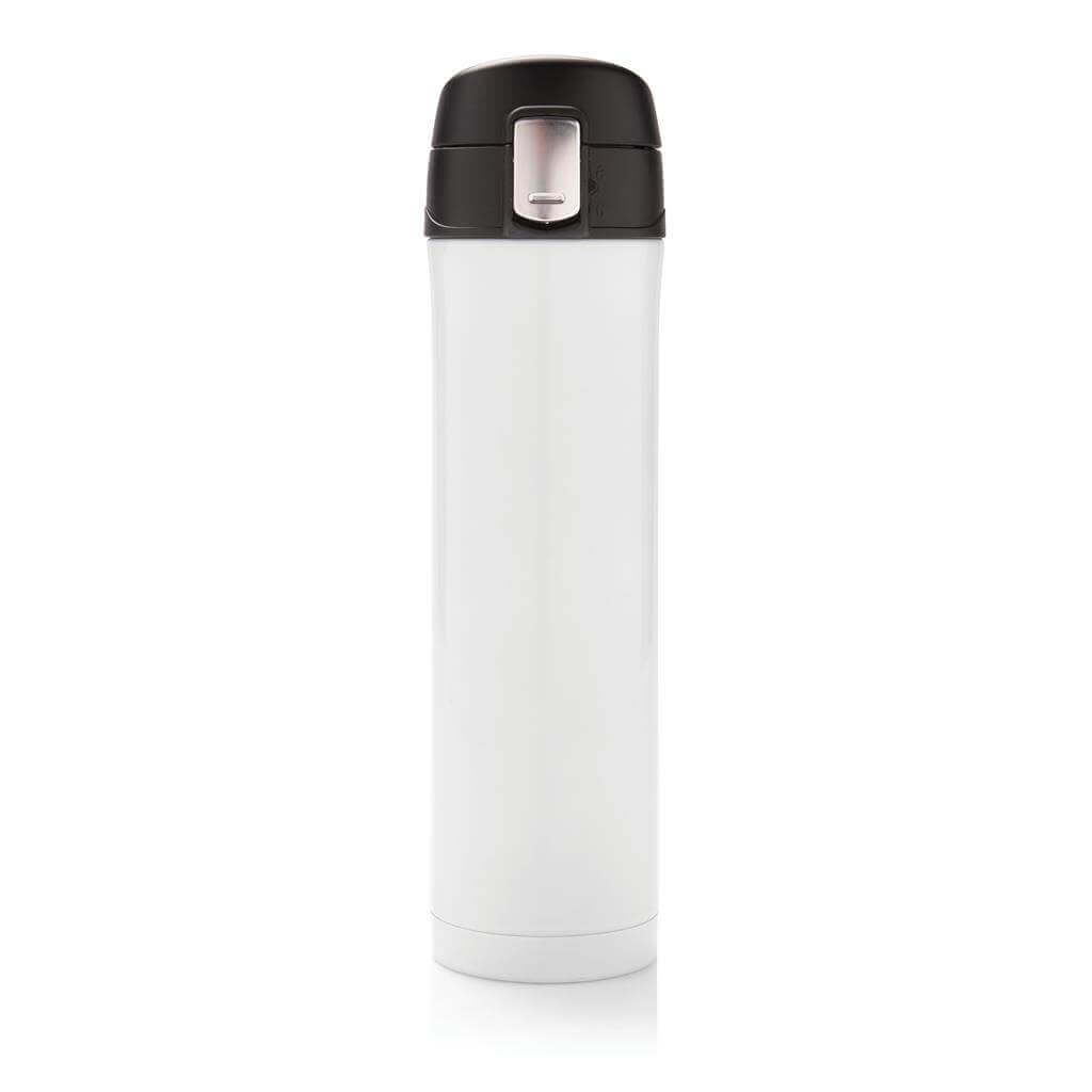 Termoska z nerez oceli s dvojitou stěnou udrží vaše nápoje teplé až po dobu 5 hodin nebo chladné po dobu 15 hodin. Uzávěr lze uzavřít a uzamknout pro zabránění vylití tekutiny. Uzávěr je uzpůsoben pro snadné čištění a mytí i v myčce. Jedinečný design termosky umožňuje pohodlné a bezpečné uchopení a ovládání otevírání jednou rukou. Díky své velikosti se termoska hodí do všech držáků nápojů do auta. Objem: 450 ml. PMS color 1: 288C, PMS color 2: Black PMS color 1: Black, PMS color 2: Black PMS color 1: 428, PMS color 2: Black PMS color 1: White, PMS color 2: Black PMS color 1: 186, PMS color 2: Black