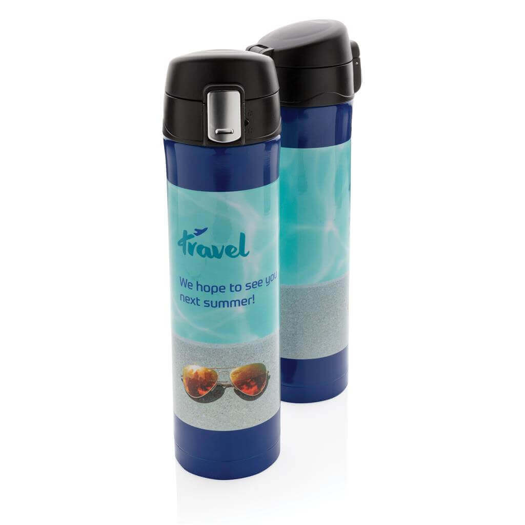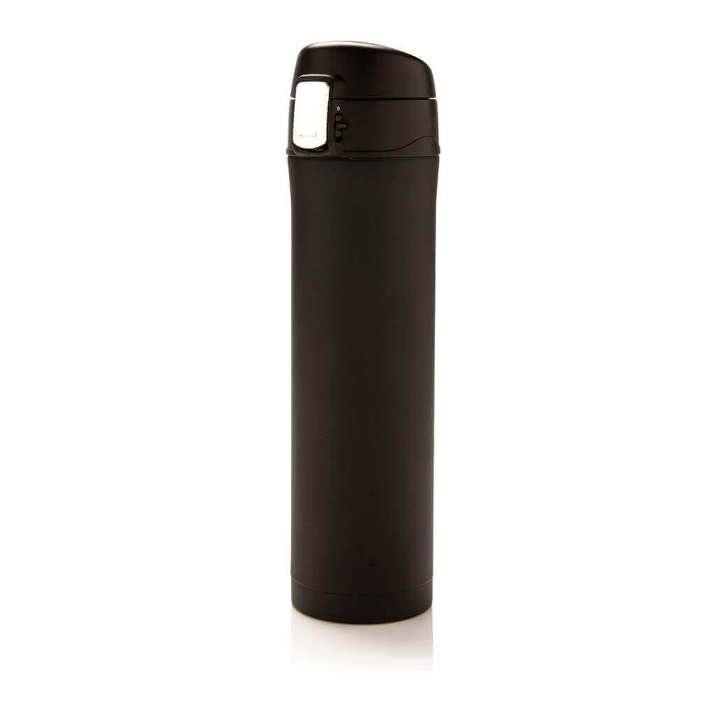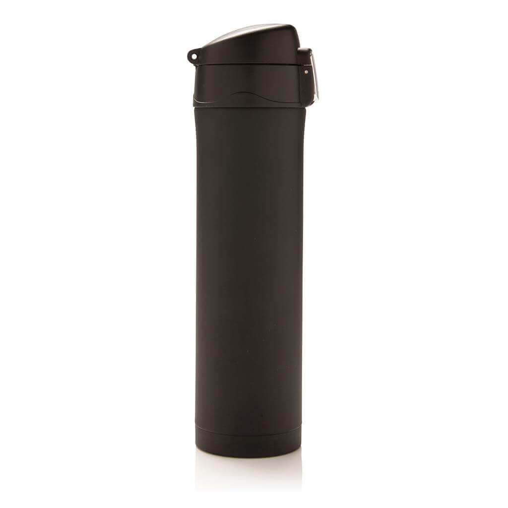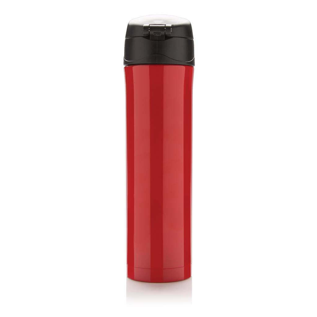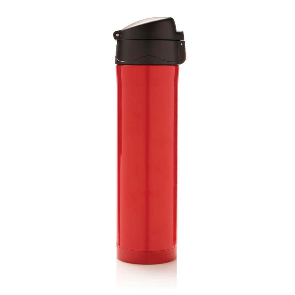 Termoska z nerez oceli s dvojitou stěnou udrží vaše nápoje teplé až po dobu 5 hodin nebo chladné po dobu 15 hodin. Uzávěr lze uzavřít a uzamknout pro zabránění vylití tekutiny. Uzávěr je uzpůsoben pro snadné čištění a mytí i v myčce. Jedinečný design termosky umožňuje pohodlné a bezpečné uchopení a ovládání otevírání jednou rukou. Díky své velikosti se termoska hodí do všech držáků nápojů do auta. Objem: 450 ml. PMS color 1: 288C, PMS color 2: Black PMS color 1: Black, PMS color 2: Black PMS color 1: 428, PMS color 2: Black PMS color 1: White, PMS color 2: Black PMS color 1: 186, PMS color 2: Black