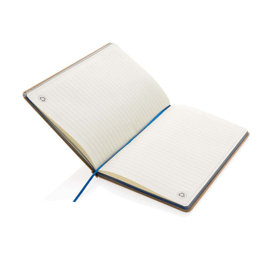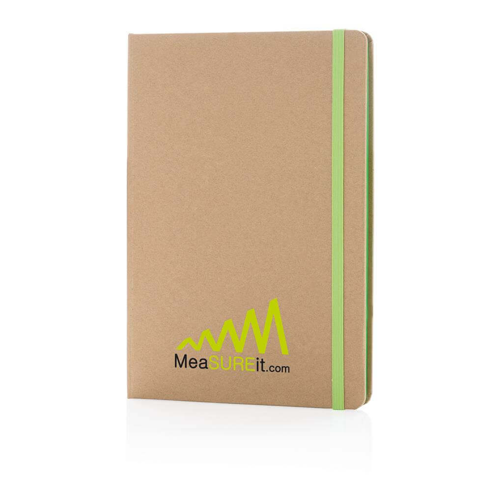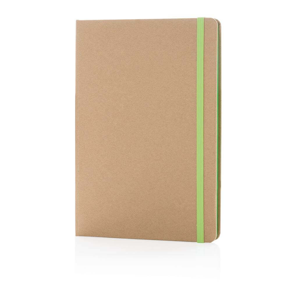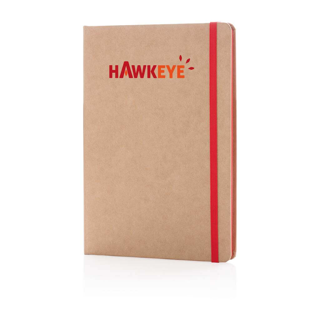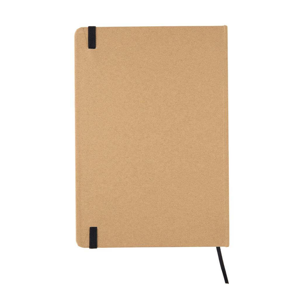 Ekologický poznámkový blok s obalem z kraftového papíru a listy z recyklovaného papíru. 72 listů/144 stran papíru o gramáži 70 g/m2. Krémový odstín listů. Se záložkou a uzavíráním na gumičku ve stejném barevném provedení. PMS color 1: Black PMS color 1: 485 PMS color 1: 286 PMS color 1: 368
