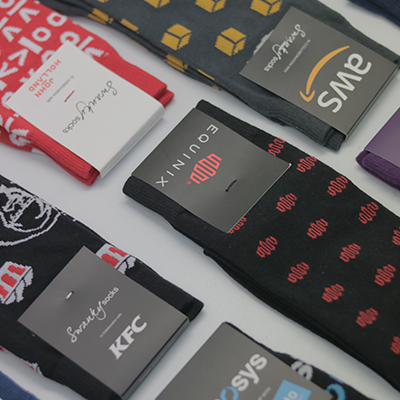 Elegantní ponožky na míru, materiál: 65% česaná bavlna, 30% nylon, 5% elastan. Jedna velikost sedne většině. Slaďte nejoblíbenější designy s image vaší společnosti. Vyberte si z 32 tkaných vzorů, dejte nám vědět své požadované barvy pantone (až 6 barev), vyberte místo, kam přidat návrhy loga a vyberte obal. Máte vytvořený jedinečný dárek.
