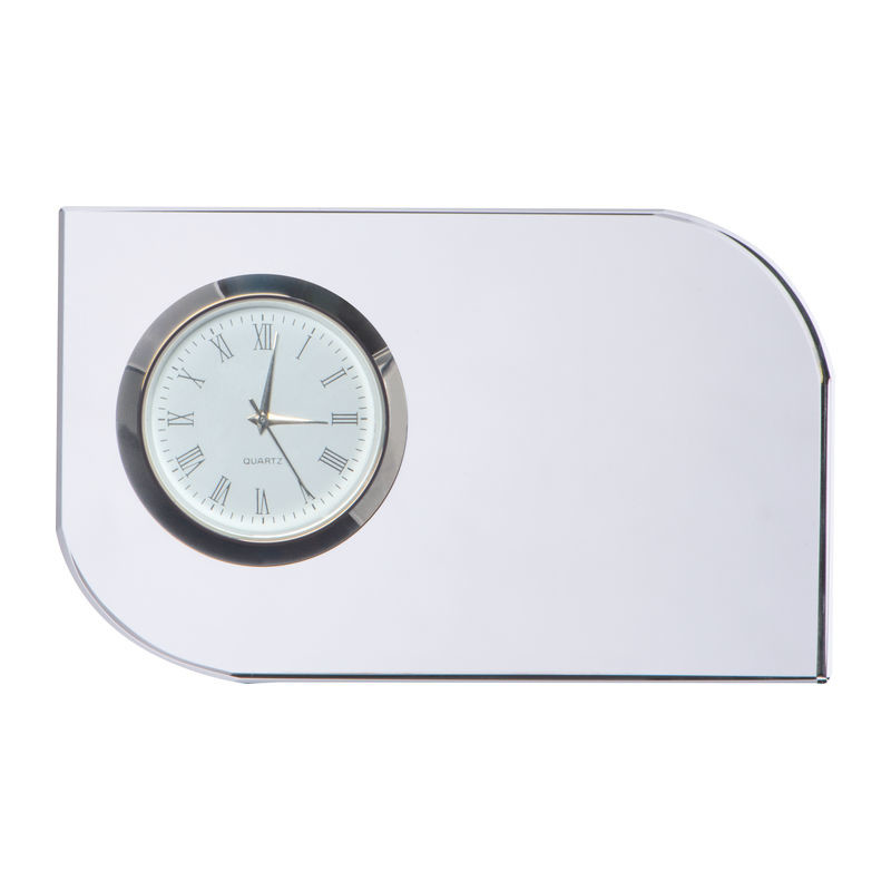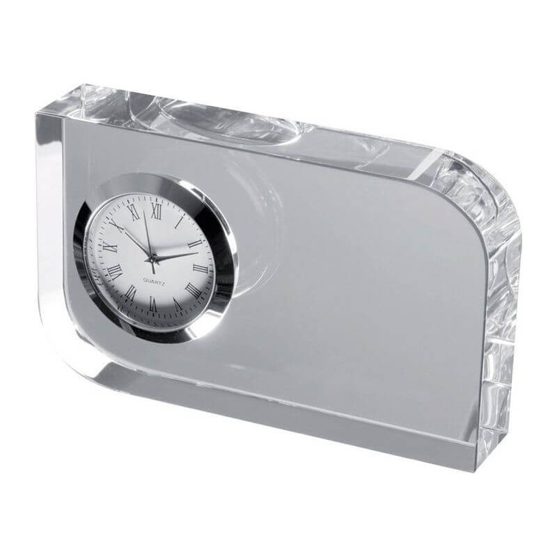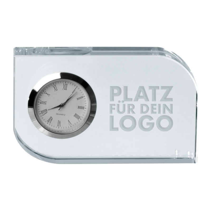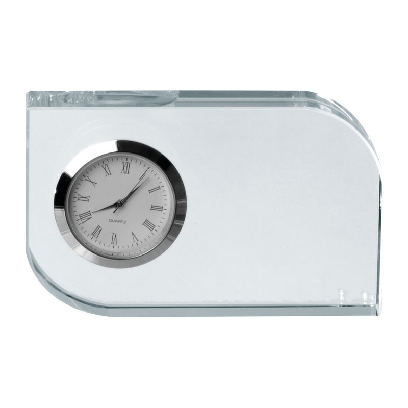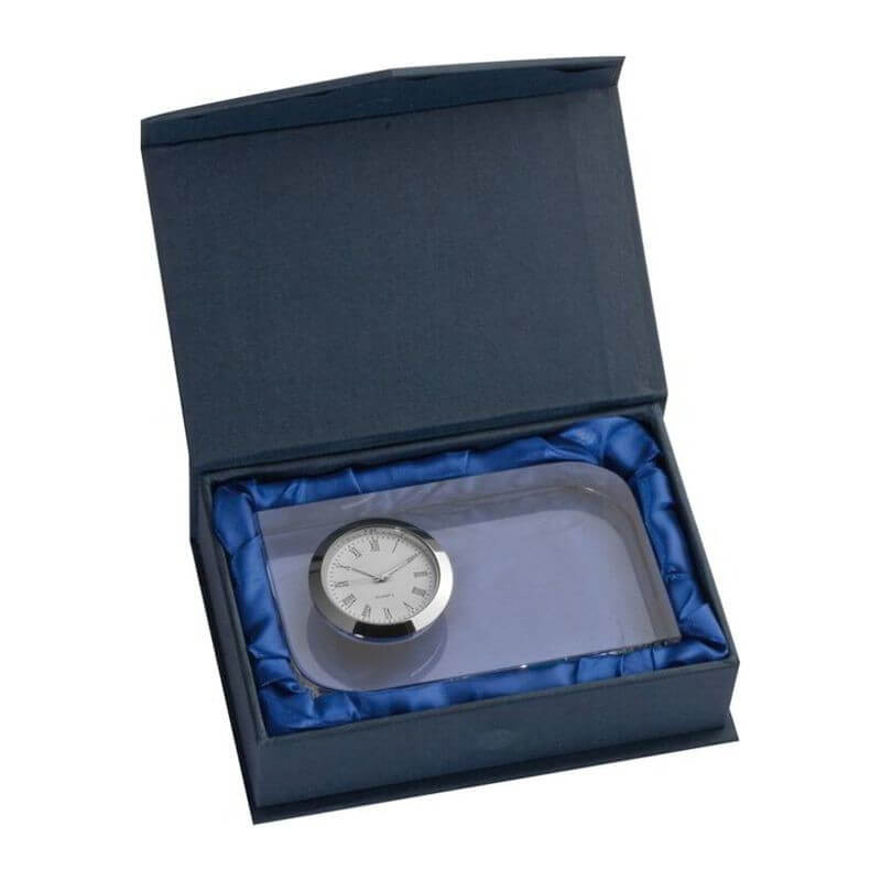 Elegantní skleněná dekorace s malými hodinami a místem pro Vaše logo, které bude gravírované do skla. Bezpečně zabalený v modré dárkové krabici se saténovou vložkou.