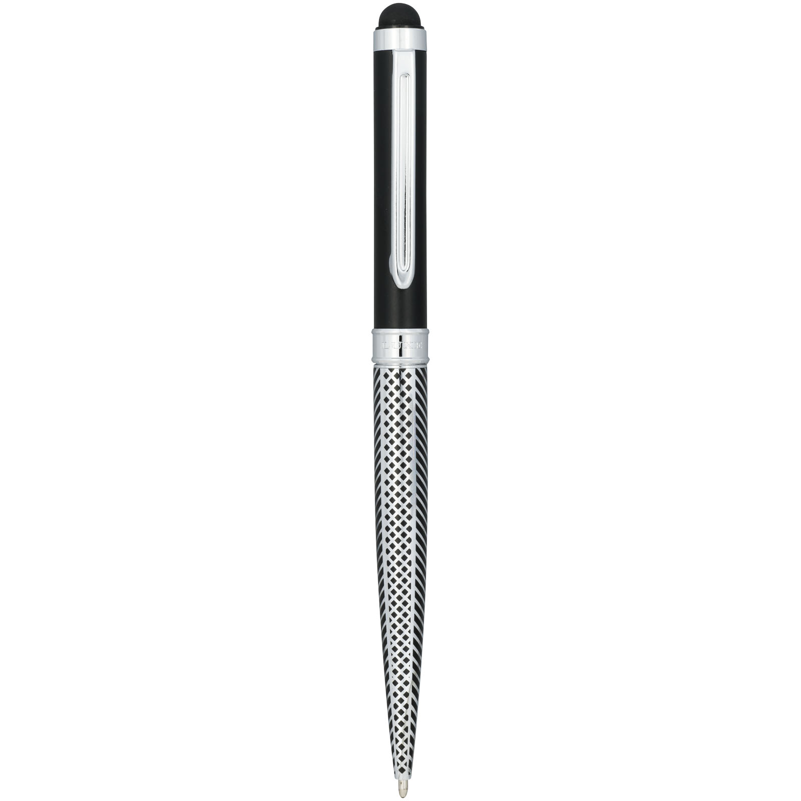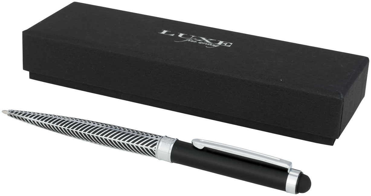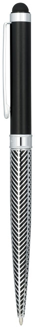 Exkluzivní design Stylus kuličkového pera se stylovým vzorováním spodní části těla. Včetně náhradní, prémiové, kvalitní, modré, inkoustové náplně a zabaleno v "LUXE" dárkové krabičce (16,5x4,5x2,8 cm). ABS plast, Kov.