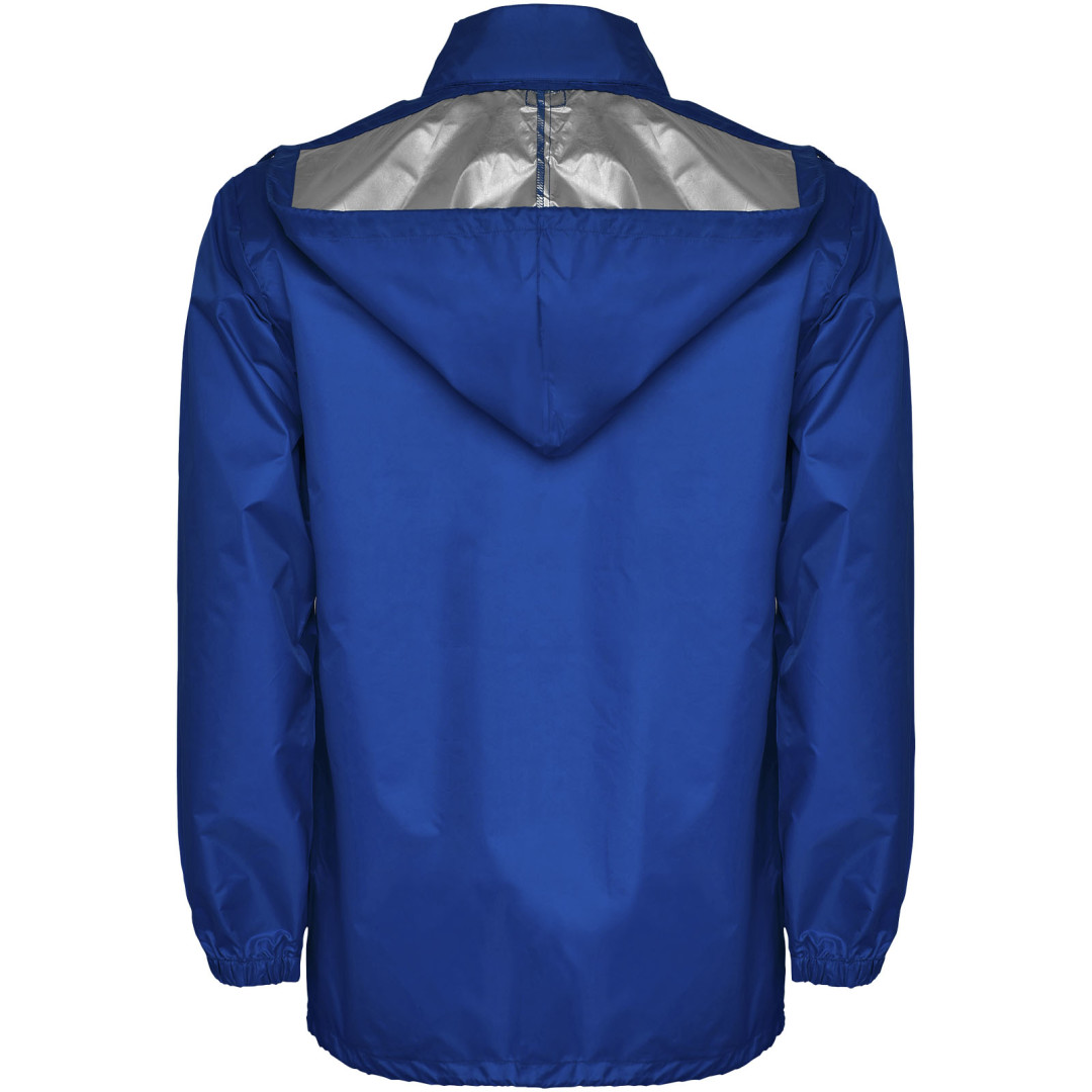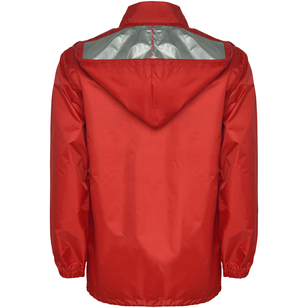 Nepromokavá pláštěnka. Vysoký výstřih a skládací kapuce s nastavitelnou šňůrkou. Přední zip s odpovídajícím taháčkem. Dvě boční kapsy s klopou. Elastické manžety. Elastický pásek uvnitř kapsy pro složení a uskladnění. Voděodolný model. Model měří 185 cm a má na sobě velikost L.