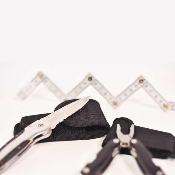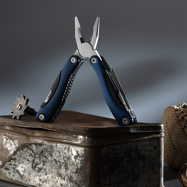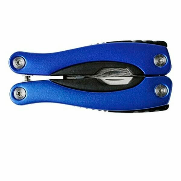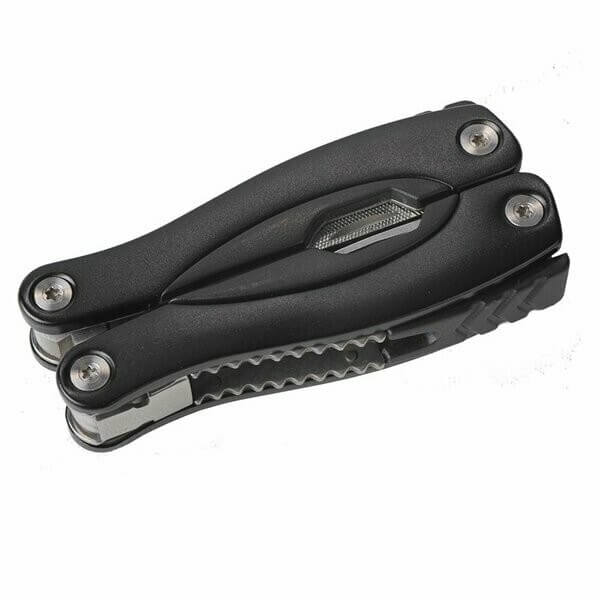 Set nářadí s 9 funkcemi v pouzdře z polyesteru. Funkce: pilka, ploché šroubováky, otvírák na konzervy, pilník, kombinační kleště, škrabka na šupiny a odstraňovač rybích háků, otvírák na láhve, křížový šroubovák a nůž.