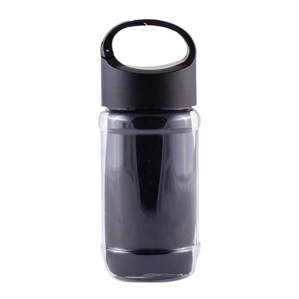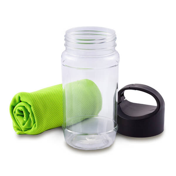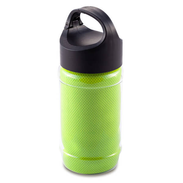 Sportovní lahev z plastu s ručníkem na osvěžení z mikrovlákna (rozměr po rozložení 90 x 35 cm) s vynikající absorpční schopností. Namočte ručník do vody, vyždímejte, protřepejte - a je připravený k vašemu zchlazení a osvěžení.