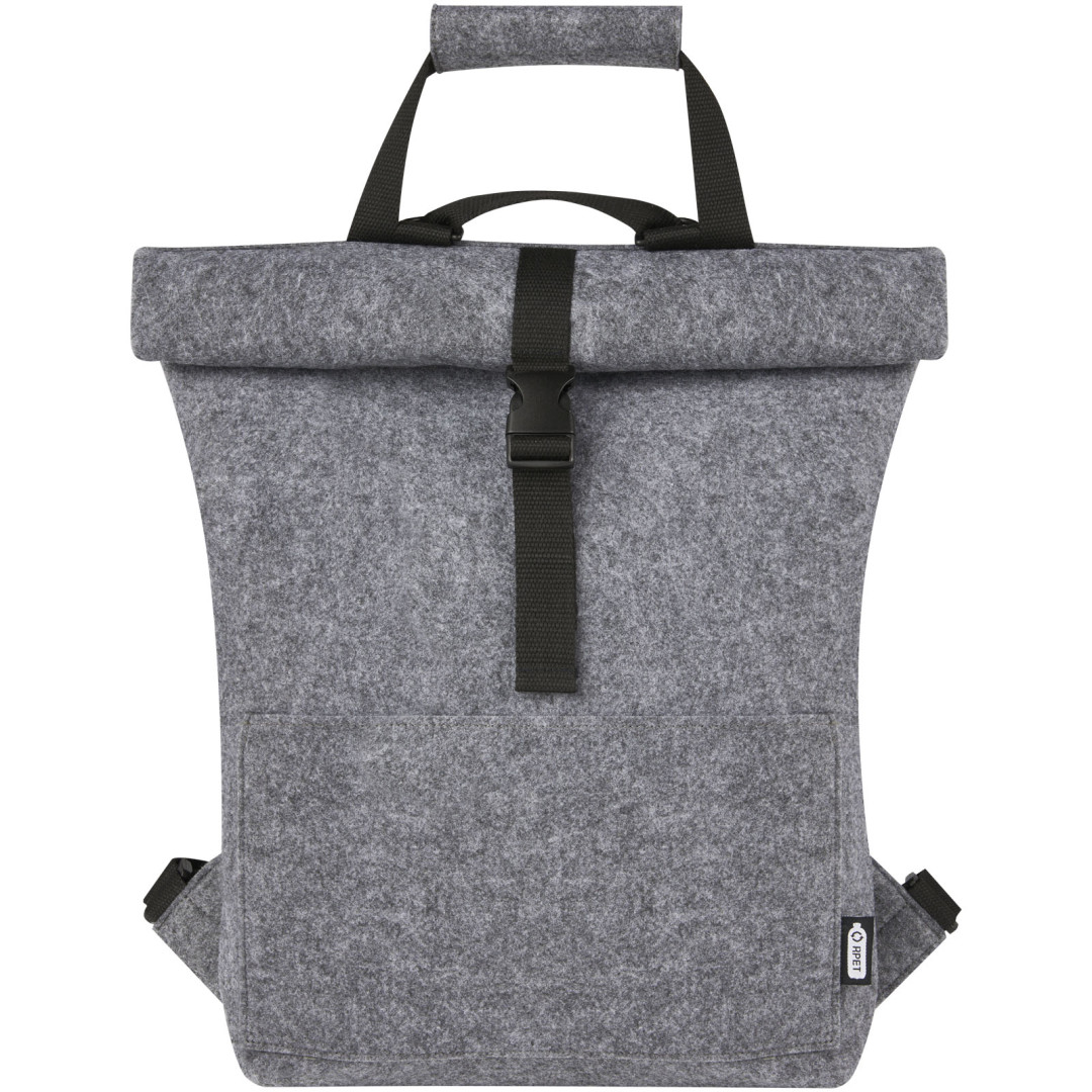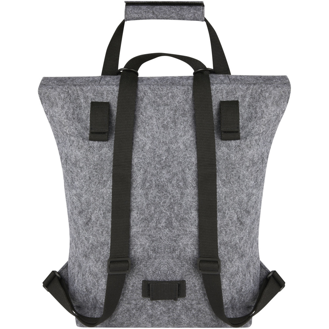 Multifunkční a trendy kombinace rolovacího batohu a tašky na kolo vyrobená z vysoce kvalitní, měkké a odolné recyklované plsti s certifikací GRS. Obsahuje velkou hlavní přihrádku, přední kapsu, nastavitelné ramenní popruhy a 3 popruhy s háčky pro připevnění brašny k zadní části kola. Ramenní popruhy lze snadno přeměnit na systém dlouhých rukojetí nebo je sbalit, aby se popruhy nezachytily do točícího se kola.