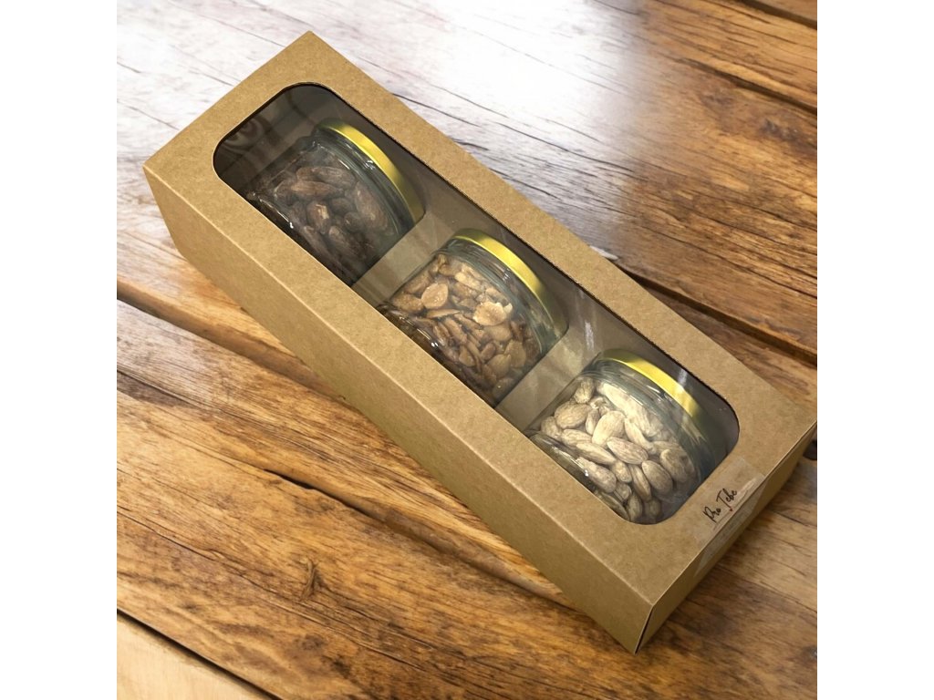 Elegantní firemní dar, který spojuje reprezentativní vzhled a poctivou chuť. V krabičce naleznete tři skleněné dózy po 180 g, čerstvě plněné vybranými oříšky. Složení přizpůsobíme vašim preferencím – od mandlí, kešu a pistácií přes čoko-dražé až po slané a medové mixy. Sklo působí prémiově, zachovává čerstvost a je opakovaně použitelné. Branding na míru: logo na víčku, etikety v korporátních barvách, personalizované přání či visačka. Ideální na Vánoce, výročí, onboarding i poděkování týmu. Rozměry krabičky: 350 × 130 × 90 mm. Cena za mandle uzené, mandle solené, mandle v medu a soli 25,57 €