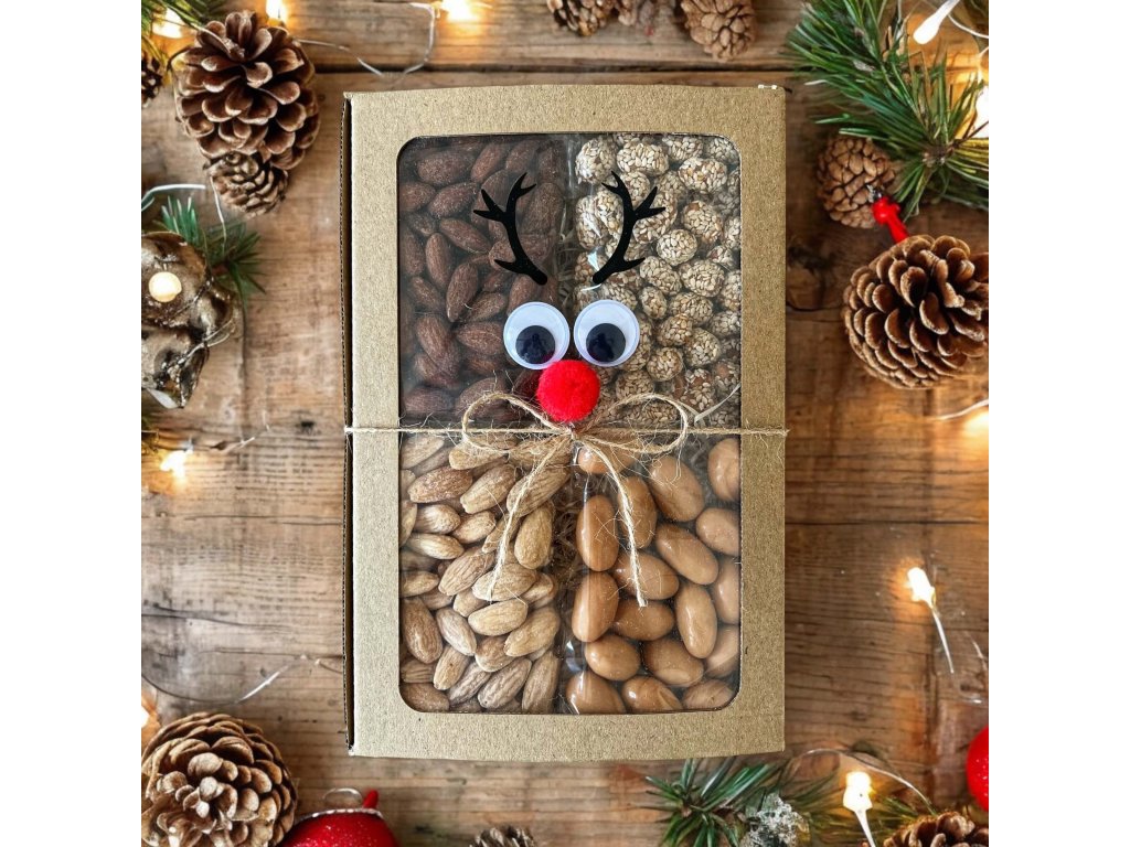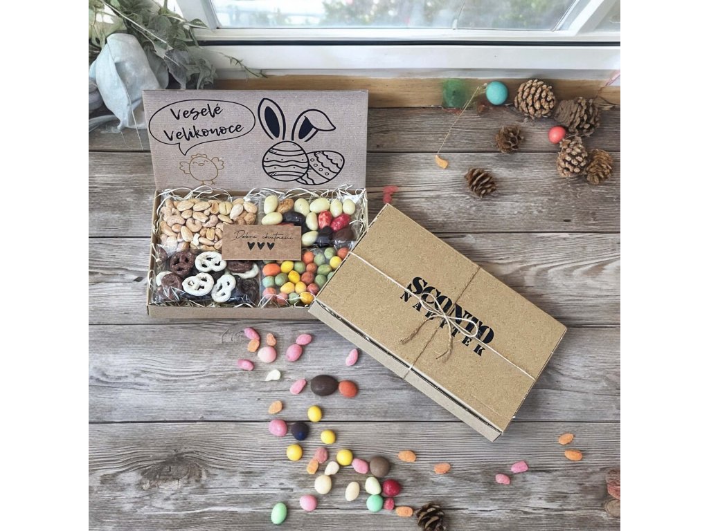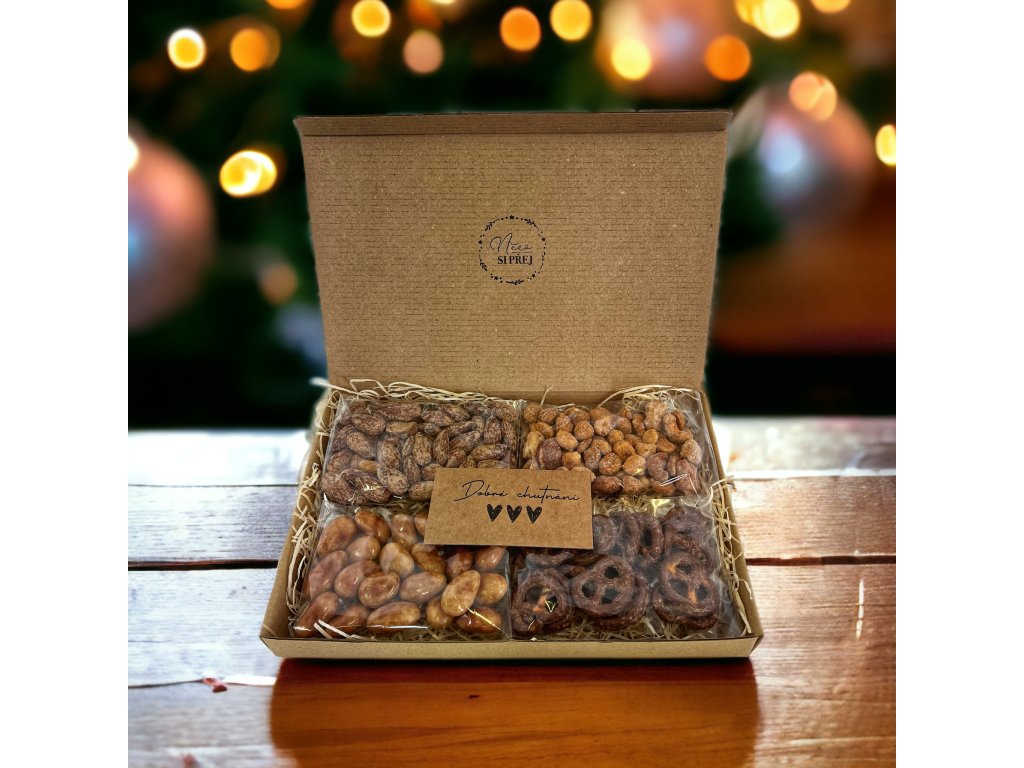 Oblíbená firemní volba: dárková krabička 4×80 g se složením na míru. Vybereš si druhy a poměry (oříšky přírodní/solené, v čokoládě, ovocné mixy…), my doladíme branding (logo, barvy, visačka, minietiketa) a vše ručně zabalíme do designové krabičky (průhledné i neprůhledné víko). Skvělé na konference, sezónní balíčky i poděkování. Kalkulace podle množství, náplně a grafiky. Rozměry krabičky: 245 × 165 × 25 mm Cena výrobku na foto 349 Kč