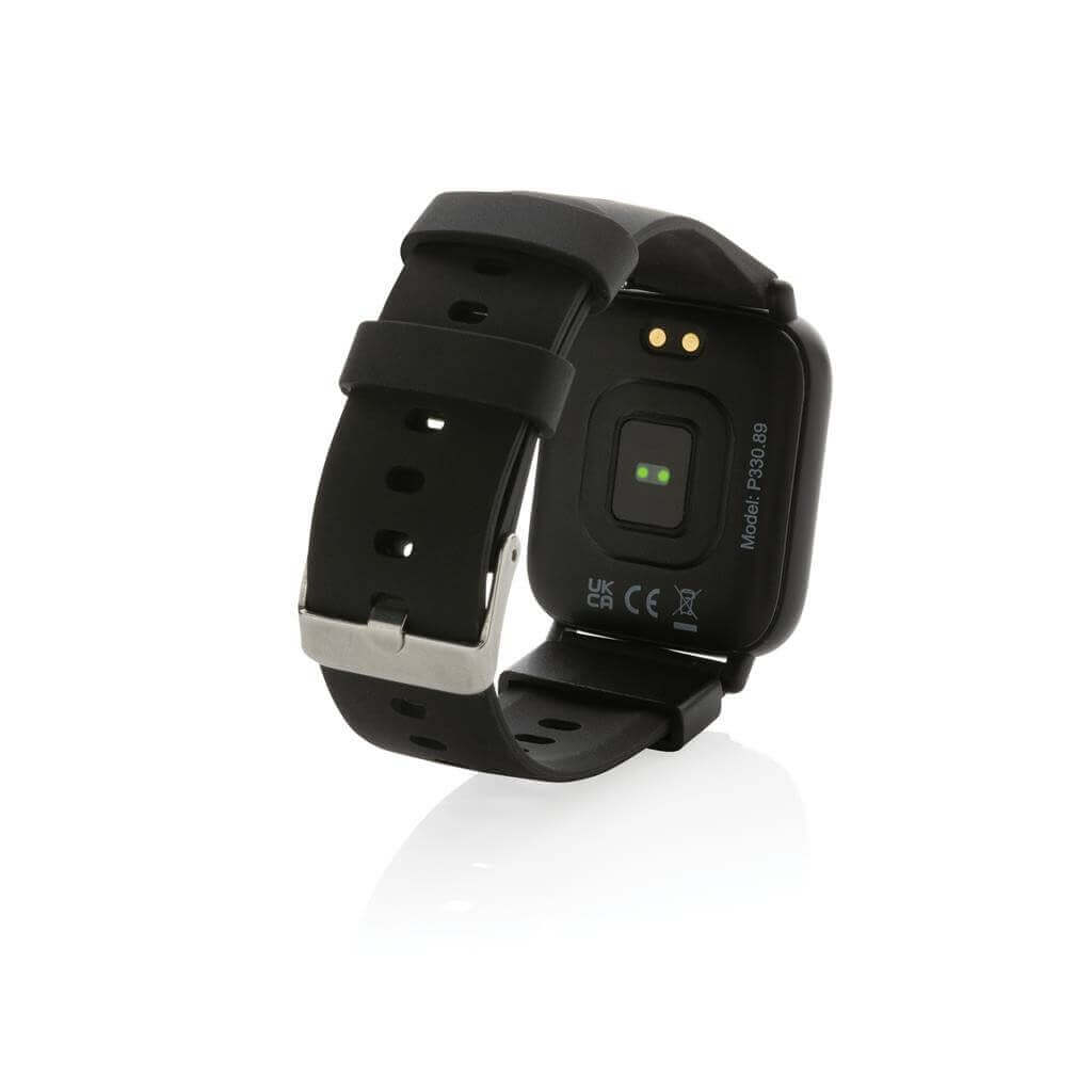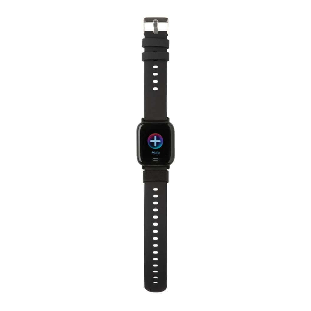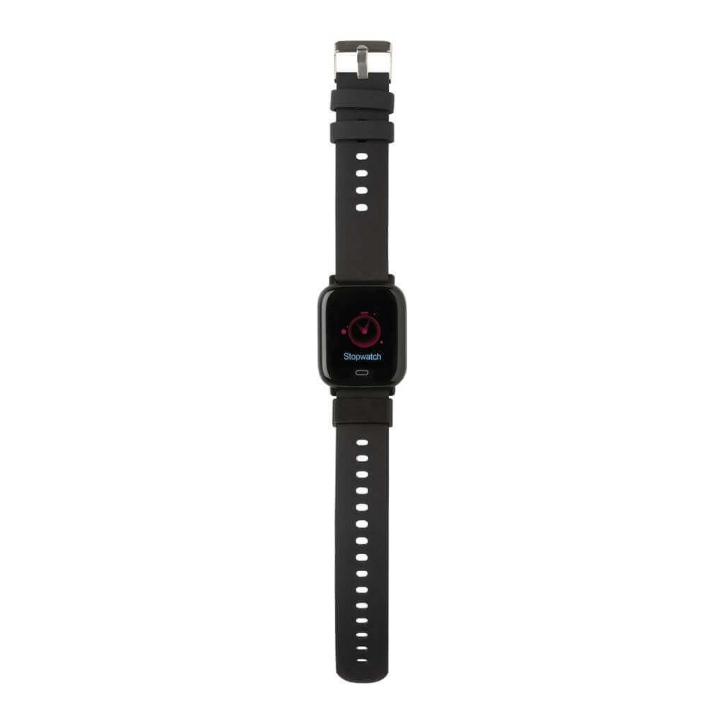 Moderní voděodolné (IPX67) hodinky pro aktivní životní styl s 1,3" point dotykovým barevným displejem. Vyrobené z RCS recyklovaného TPE (pásek) a ABS (rám hodinek). RCS (Recycled Claim Standard) je globální standard, který umožňuje ověřit použití recyklovaného materiálu v produktu napříč celým dodavatelským řetězcem. Celkový podíl recyklátu dle váhy produktu: 31 %. Funkce zahrnují: sledování spánku, krokoměr, měření vzdálenosti, počítání spálených kalorií, měření srdečního tepu, krevního tlaku, Multi-sport režim, budík, kalendář, notifikace: SMS, Facebook, Skype, WhatsApp a další. Integrovaný mikrofon pro telefonování. Kompatibilní s iOS 8.0 a výše a Android 4.0 a výše skrze BT 5.0. Pohotovostní režim: 15 dnů, pracovní režim: 5 dnů. Baleno v FSC® kraftové dárkové krabičce. Produkt i příslušenství bez PVC. 1 baterie typu Li-poly súčasťou balenia.