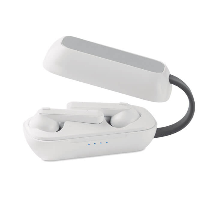 Dvě TWS 5.0 Bluetooth stereo sluchátka s integrovanou 30 mAh baterií. Doba hraní přibližně 3 hodiny. Micro USB nabíjecí kael a 400 mAh dobíjecí základna.