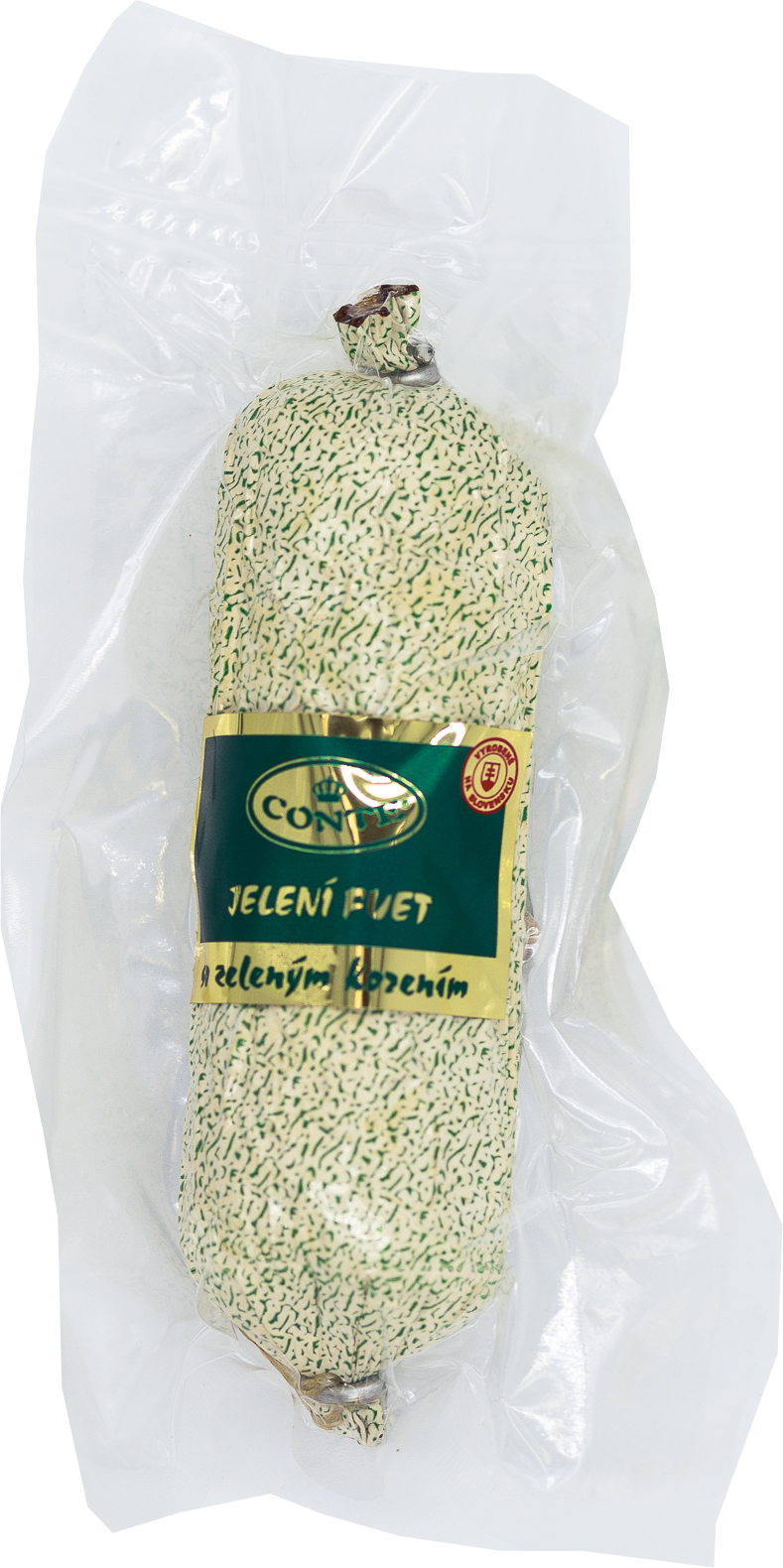 FUET se zeleným pepřem - trvanlivá sušená klobása vyrobená ze 43 % jeleního masa, 35 % vepřového masa a 20 % vepřové slaniny, ochucená směsí přírodního koření a soli. Bez tepelné úpravy, 21 dní naložený, vakuově balený (205-220 g).
