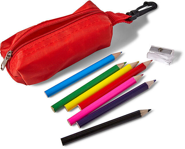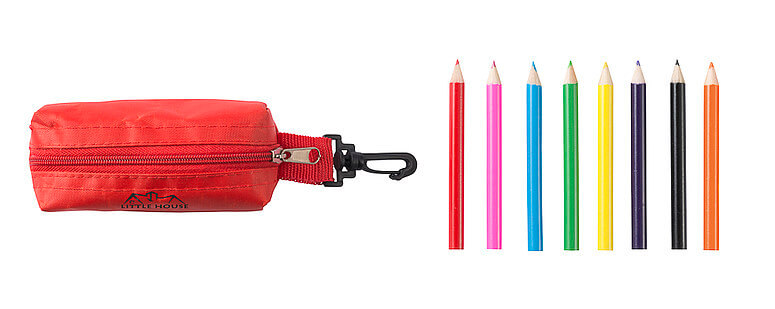 Osm tužek (naostřených) plus ořezávátko v nylonovém pouzdru (70D) s karabinou.