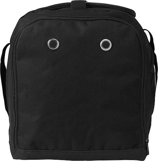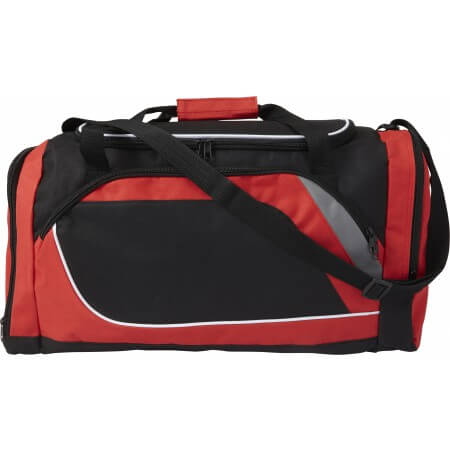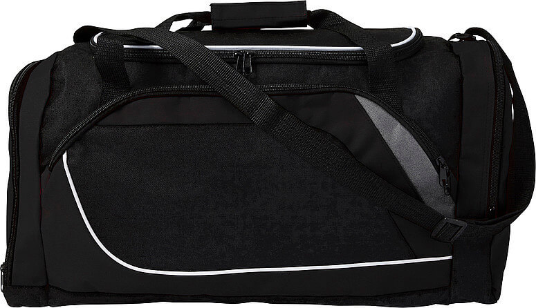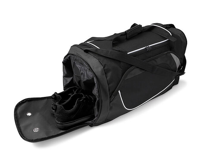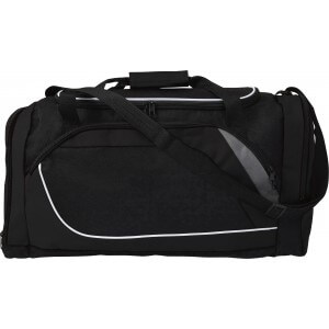 Sportovní taška z polyesteru (600D) s jednou velkou přihrádkou, jednou postranní kapsou a speciální přihrádkou na boty. Vše s černými zipy. Nastavitelný ramenní popruh.