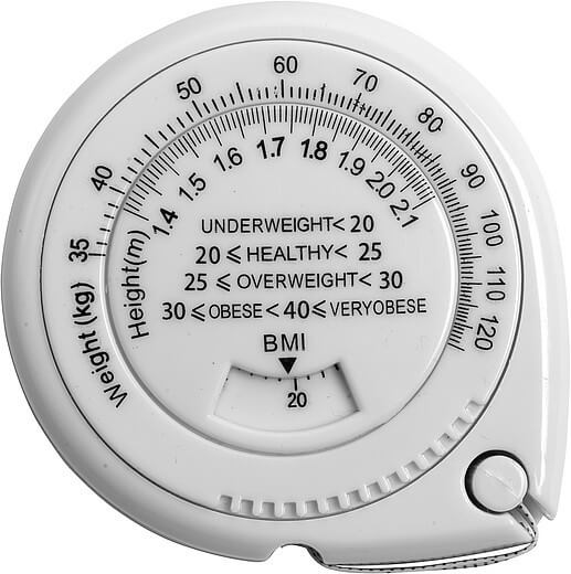 Plastový metr BMI s délkou 1,5 m s bílým tlačítkem zastavení obsahuje na přední straně indikátor hmotnosti (kg) a výšky (m). Používá se na propagační účely.