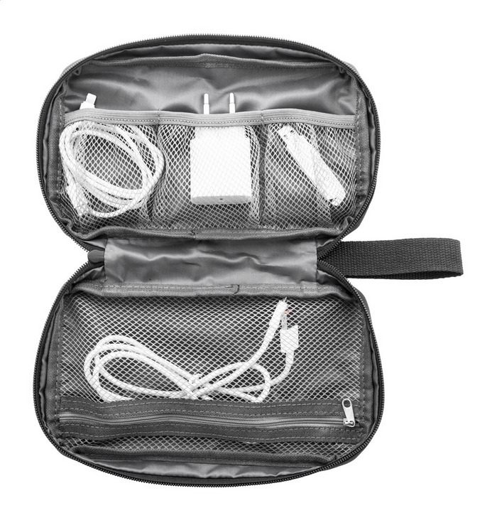 Pouzdro na organizér kabelů RPET na zip s vnitřními přihrádkami ze síťoviny a přední kapsou na zip. 900D RPET polyester s výrazným štítkem RPET.