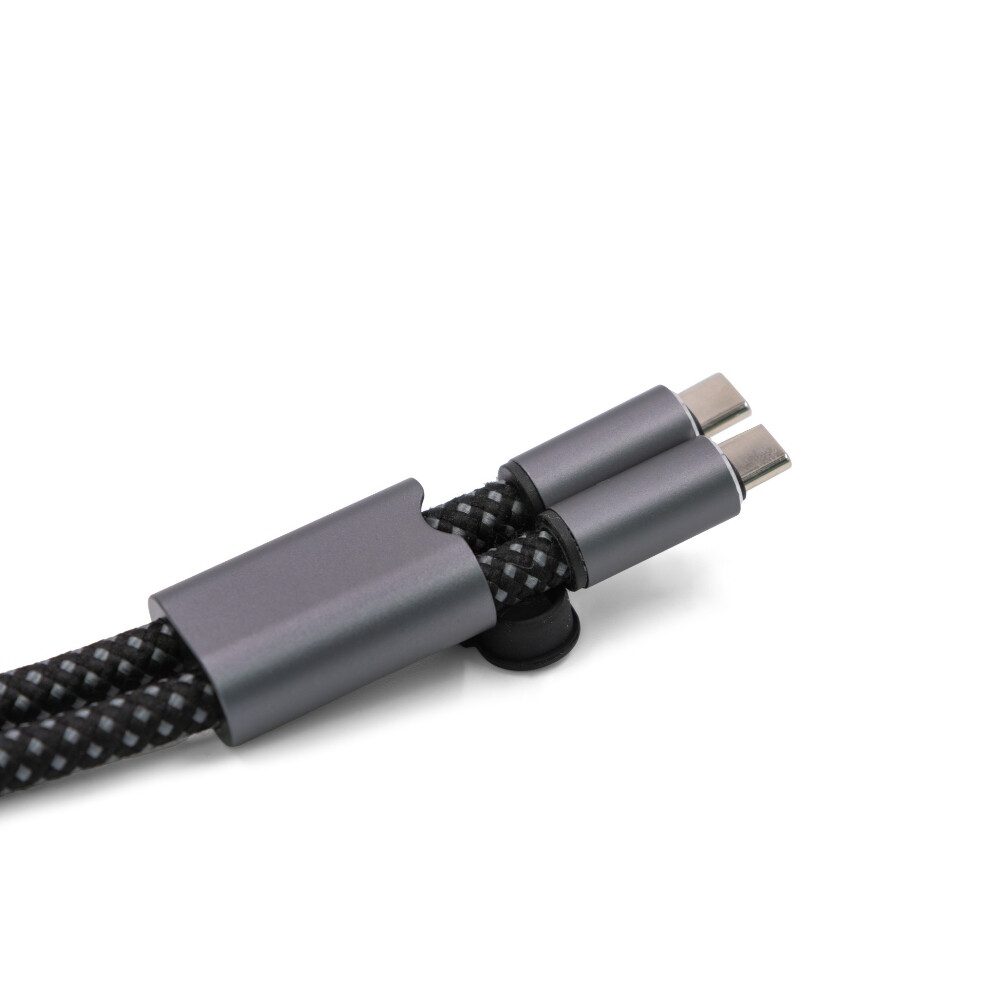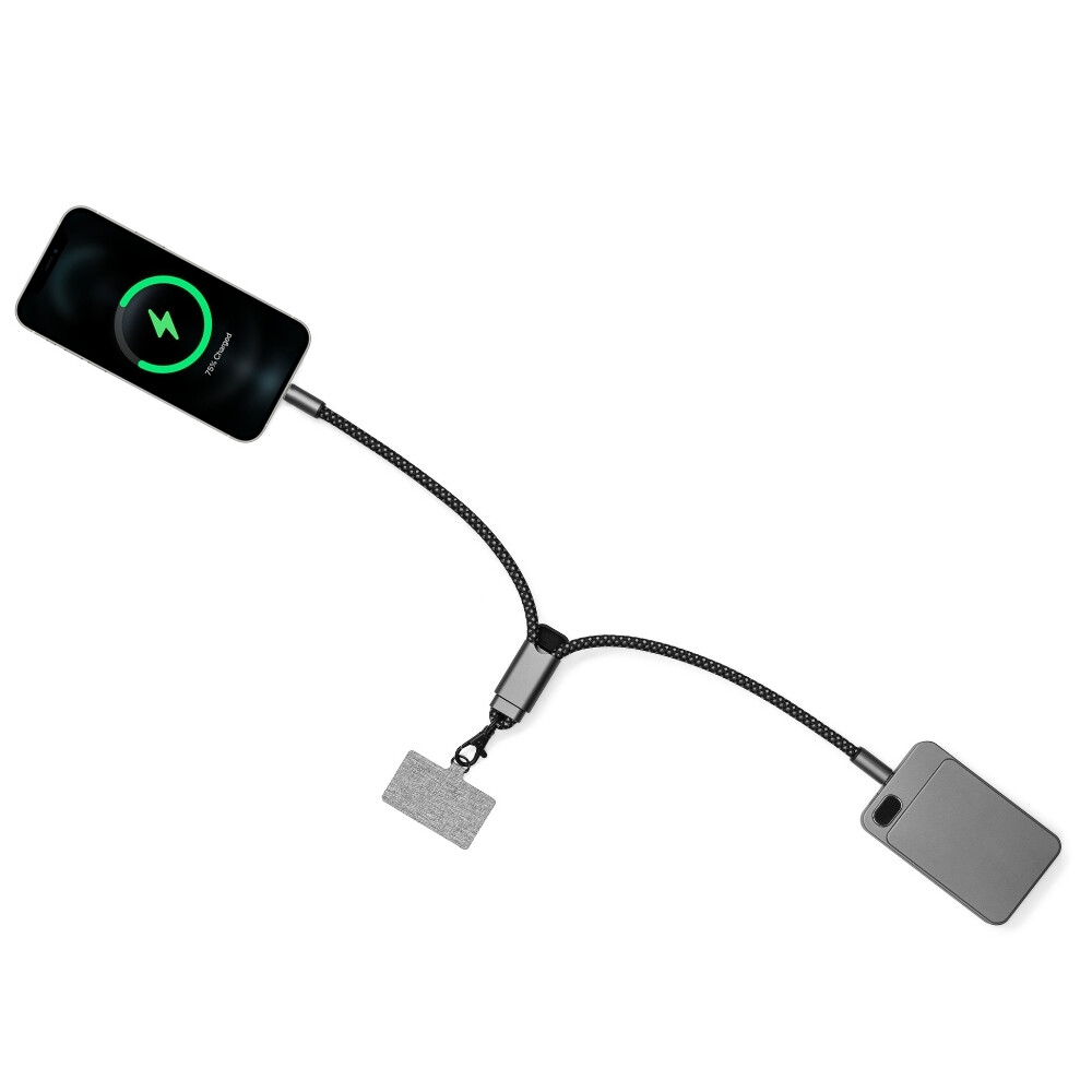 Nylonová šňůrka BrandCharger na zápěstí s držákem na telefon a funkcí dobíjecího kabelu. Vyrobená z recyklovaných PET lahví, lehká, odolná, s nastavitelnou délkou a nosností až 8 kg. Kabel obsahuje vstup s koncovkou Typ-C a výstup USB Typ-C, podporuje napájení až 60 W pro rychlé nabíjení a přenos dat. Rozměry: 44 × 0,7 × 44 cm.