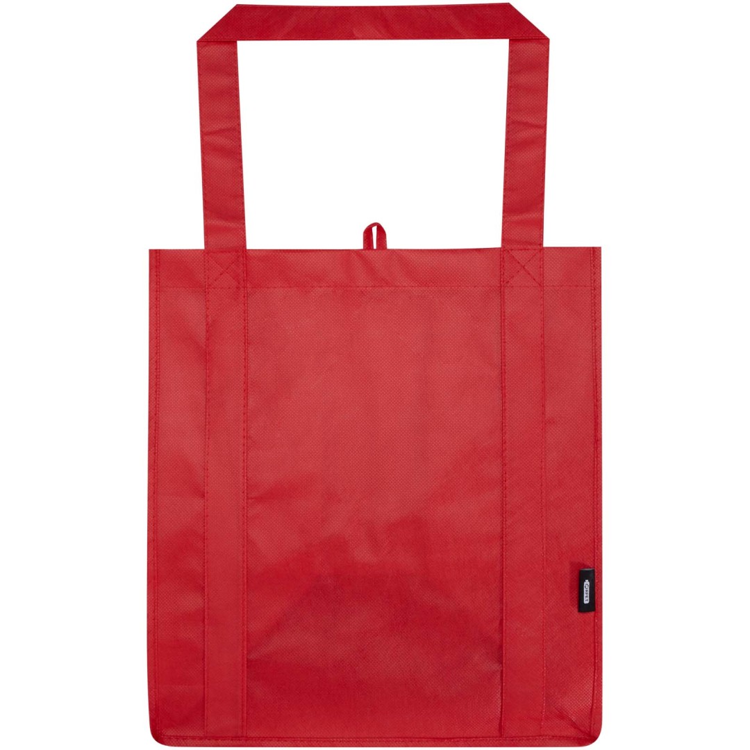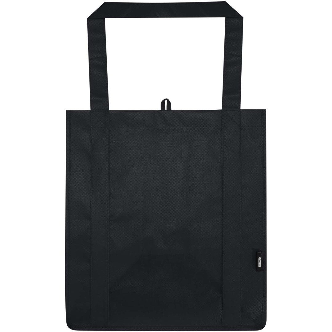 Recyklovaná nákupní taška Liberty s certifikací GRS vyrobená z odolného netkaného RPET má podpůrnou spodní desku, díky níž je univerzální a pevná. Nákupní taška má velkou hlavní přihrádku a ucha o délce 25 cm. Objemová kapacita: 29 litrů. Nosnost do 12 kg.