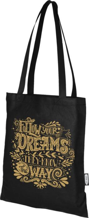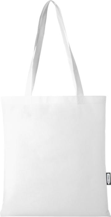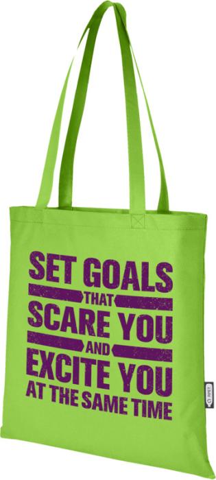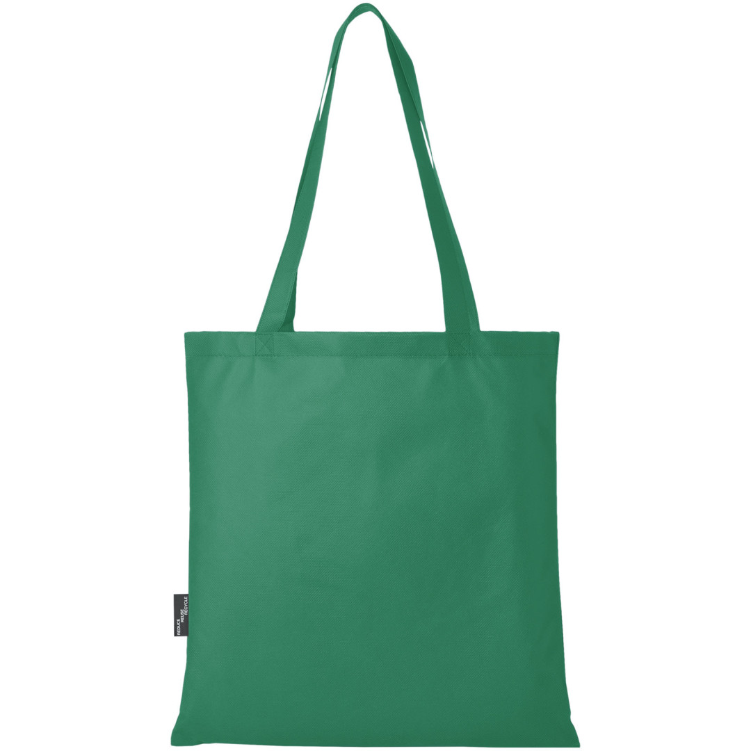 Recyklovaná velká nákupní taška Zeus GRS vyrobená z trvanlivého a proti roztržení odolného materiálu RPET (80 g/m2), je perfektní a udržitelnější variantou pro veletrhy nebo konference. Její tenký design z ní dělá elegantní model a tašku vhodnou pro přenášení lehkých předmětů, jako je notebook a pero. Ucha jsou dlouhá 29 cm, a proto se nákupní taška snadno přenáší přes rameno. Nosnost do 5 kg.