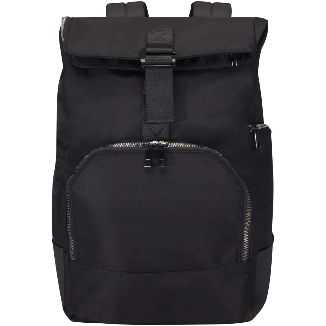 Rolovací batoh Rhine vám díky svému elegantnímu stylu a všestrannosti umožňuje plynule přecházet mezi prací a volným časem. Vyrobeno z vysoce kvalitního recyklovaného nylonu s certifikací GRS s měkkou RPET podšívkou a s prvky ze špičkové PU kůže. Batoh obsahuje vyhrazenou přihrádku na 15” notebook se 2 dalšími kapsami na elektronické příslušenství, hlavní přihrádku s praktickým otevíráním na zip ve tvaru L a 2 kapsami, přední kapsu na zip a boční kapsu. Vychutnejte si maximální pohodlí při nošení díky polstrovaným a nastavitelným ramenním popruhům a hornímu uchu potaženému PU. Objemová kapacita: 18 litrů. Nosnost do 10 kg. Neobsahuje PVC.