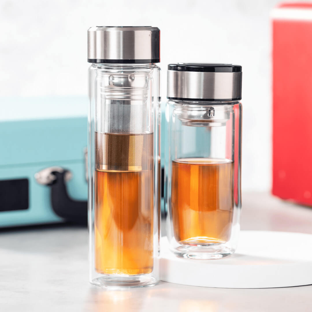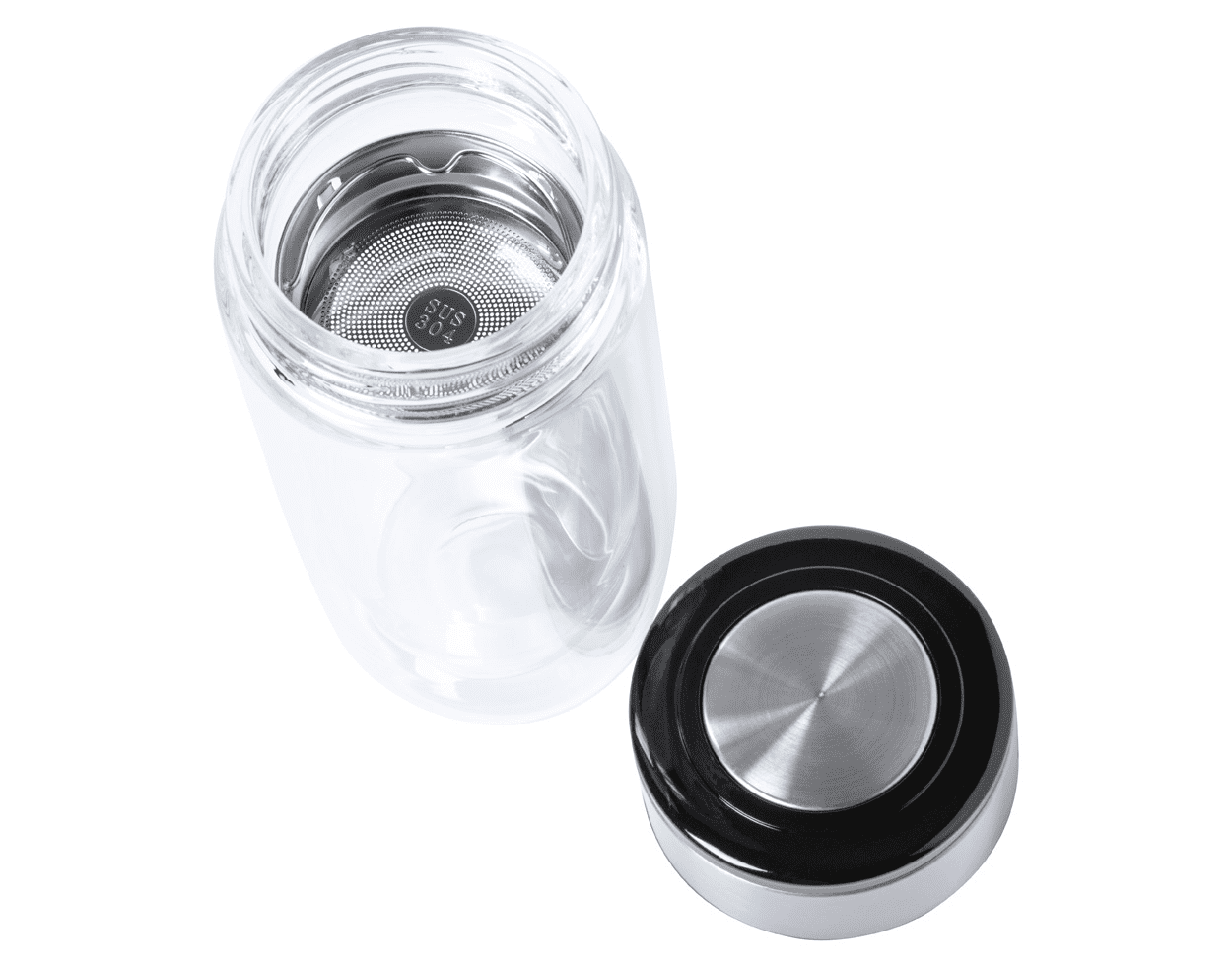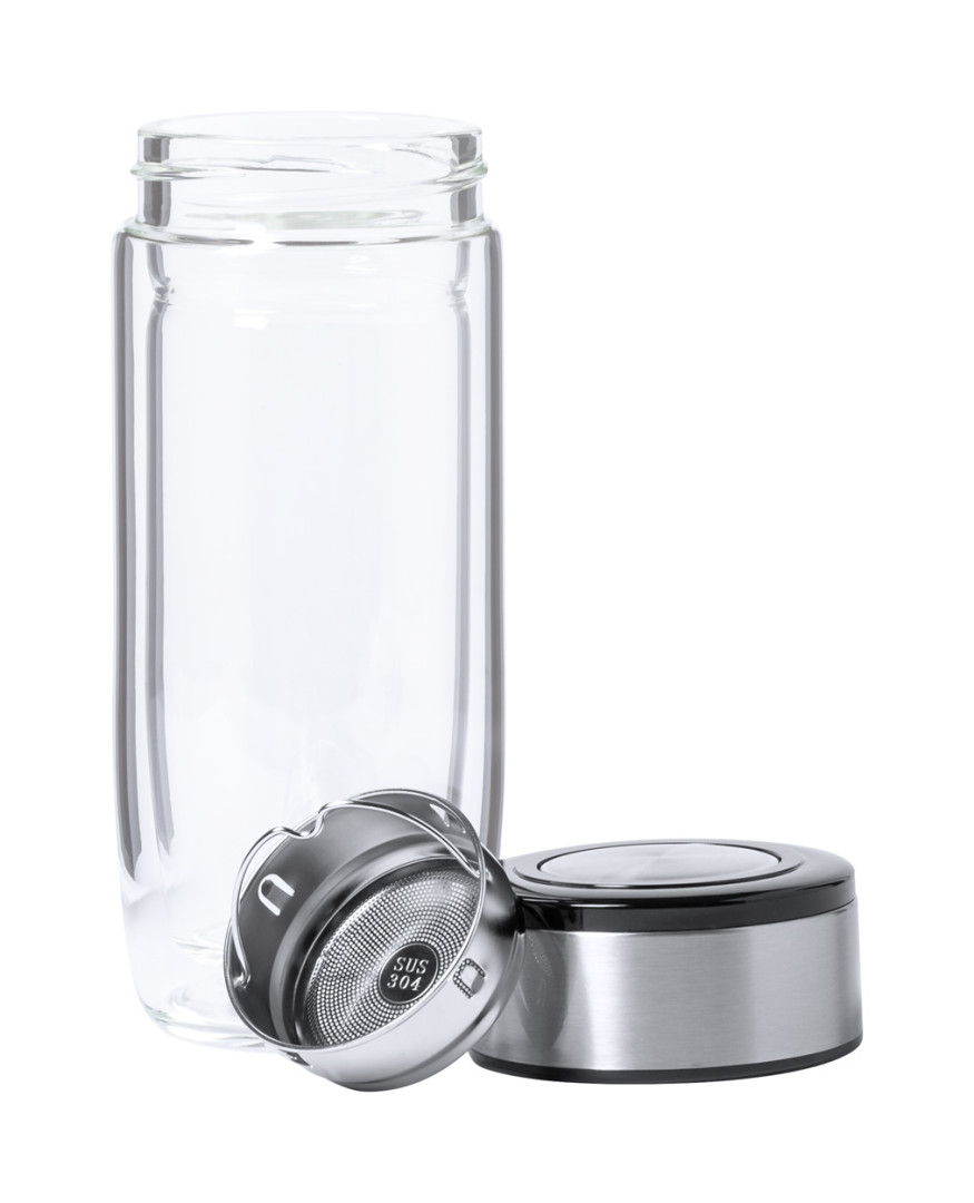 Termo hrnek z borosilikátového skla s dvojitou stěnou a víčkem z nerezové oceli. 330 ml.