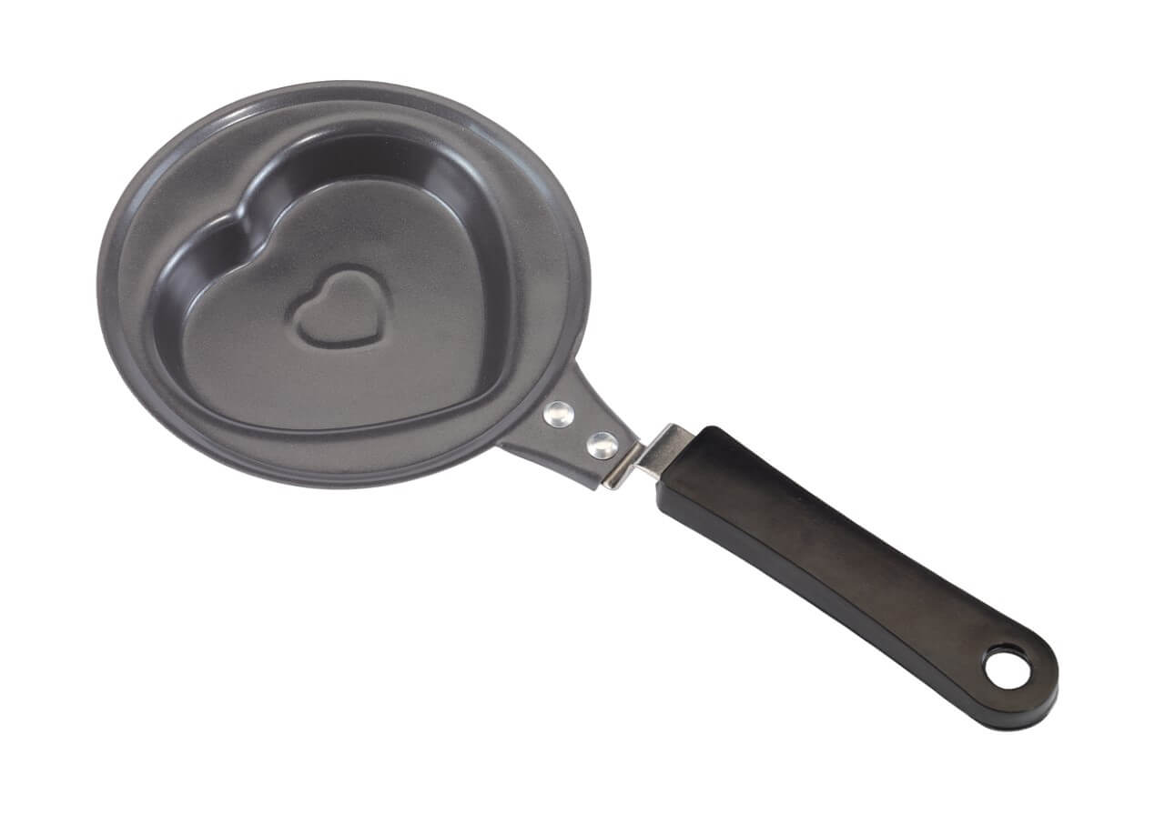 Pánev "Heart Pan": prostor ve tvaru srdce, cca. 9,5 cm dlouhá, 8 cm široká, 1,5 cm vysoká, s nelepivým povrchem, plastová rukojeť se závěsem - ideální pro přípravu míchaných vajec a palačinek