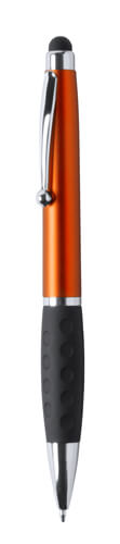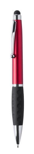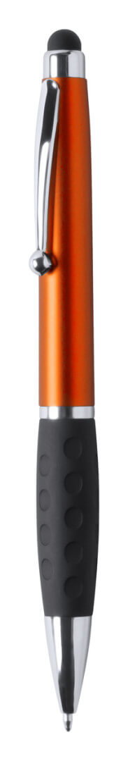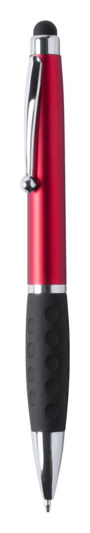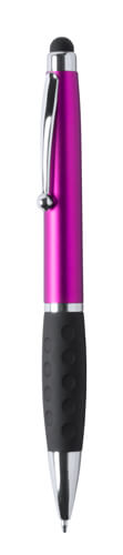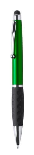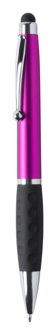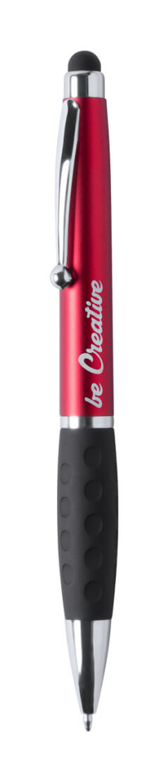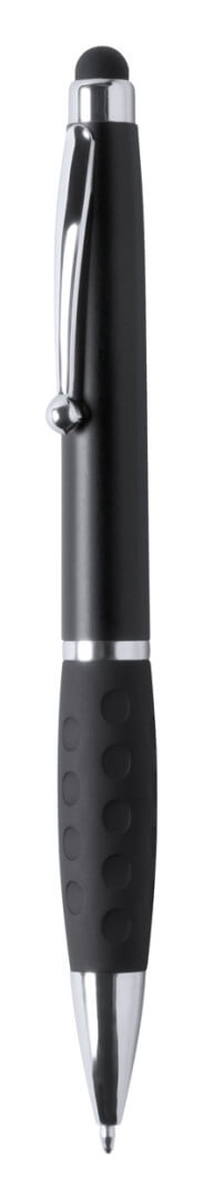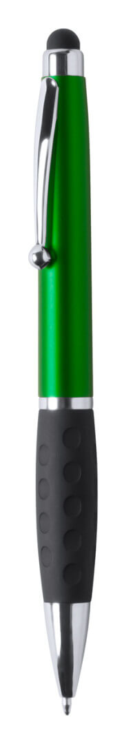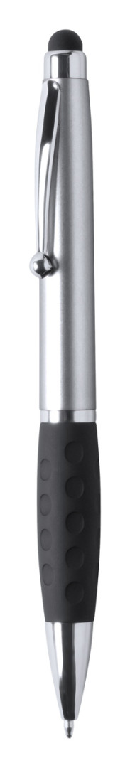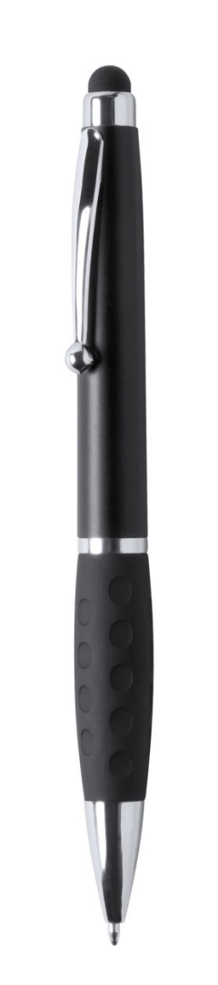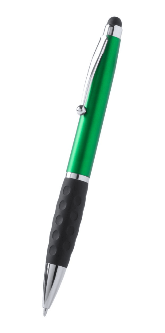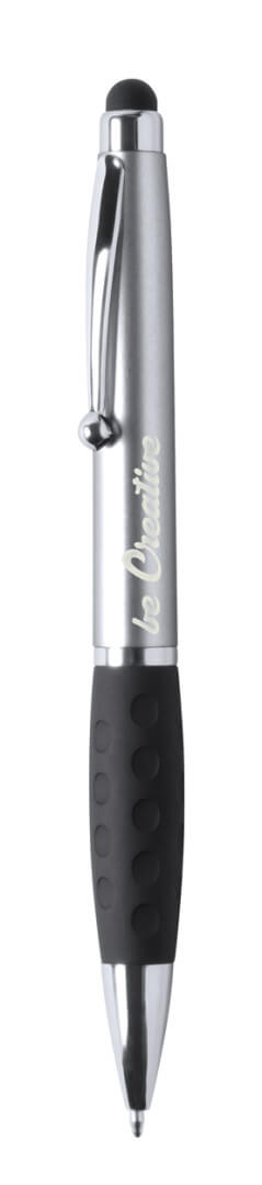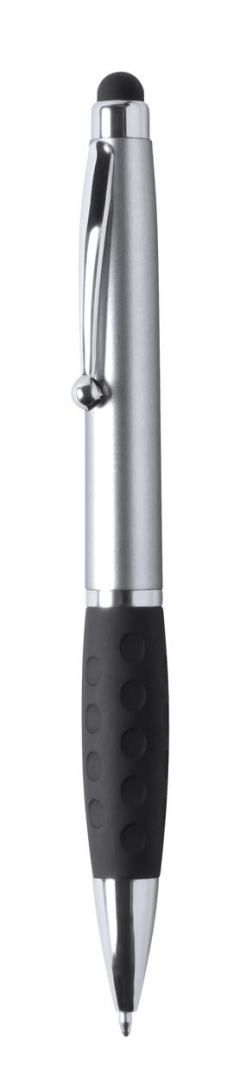 Plastové kuličkové a dotykové pero s gumovým úchopem a 1 LED světlem pro osvětlení laseru. S knoflíkovou baterií a modrou náplní.