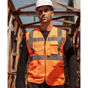 2 kapsy s klopami na suchý zip, 1 kapsa na mobilní telefon, prodyšné síťované vsadky, kroužek k připevnění karty, klíčů, atd., certifikováno podle EN ISO 20471 2013 a A1 2016, 1 reflexní pruh přes každé rameno, reflexní pruhy každý 5cm široký kolem hrudníku a těla, dobře viditelný materiál pod reflexními pruhy.