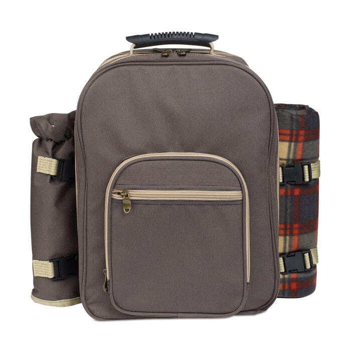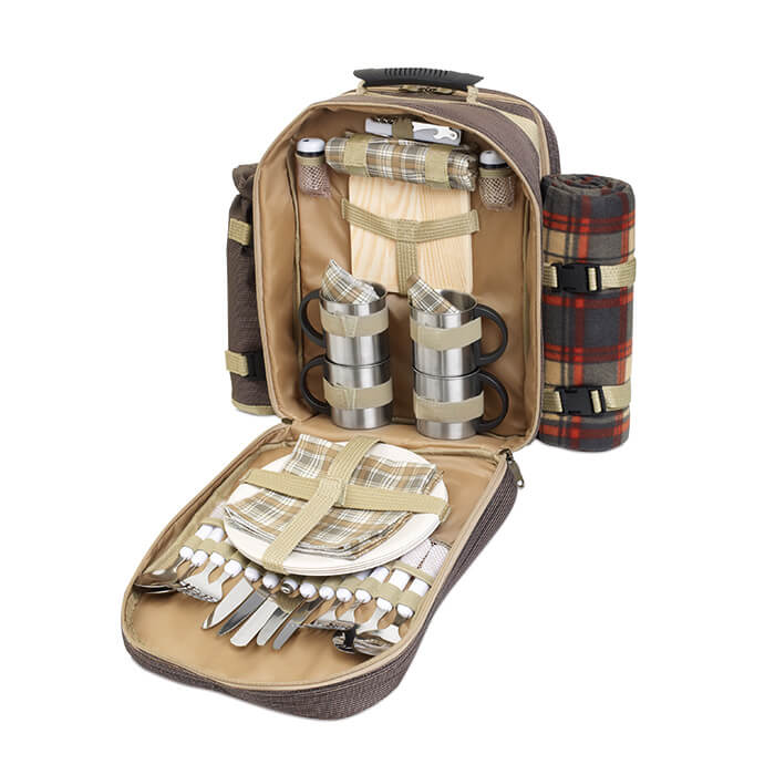Luxusní batoh na piknik pro 4 osoby s širokým příslušenstvím (příbory, talíře, deka, prkénko, nůž na pečivo, otvírák na víno, nerezové hrnky, slánka a pepřenka). 600D polyester.