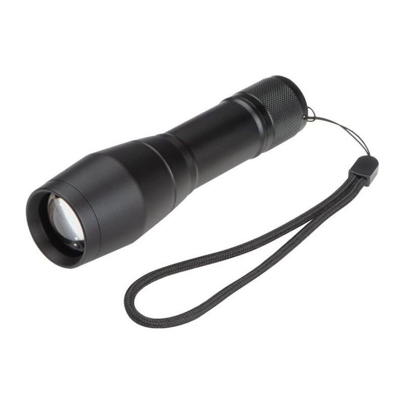 Hliníková LED svítilna s různými funkcemi svícení (stálé světlo, SOS a blikající světlo), 10W, poutko na zápěstí. Způsob potisku gravírování.