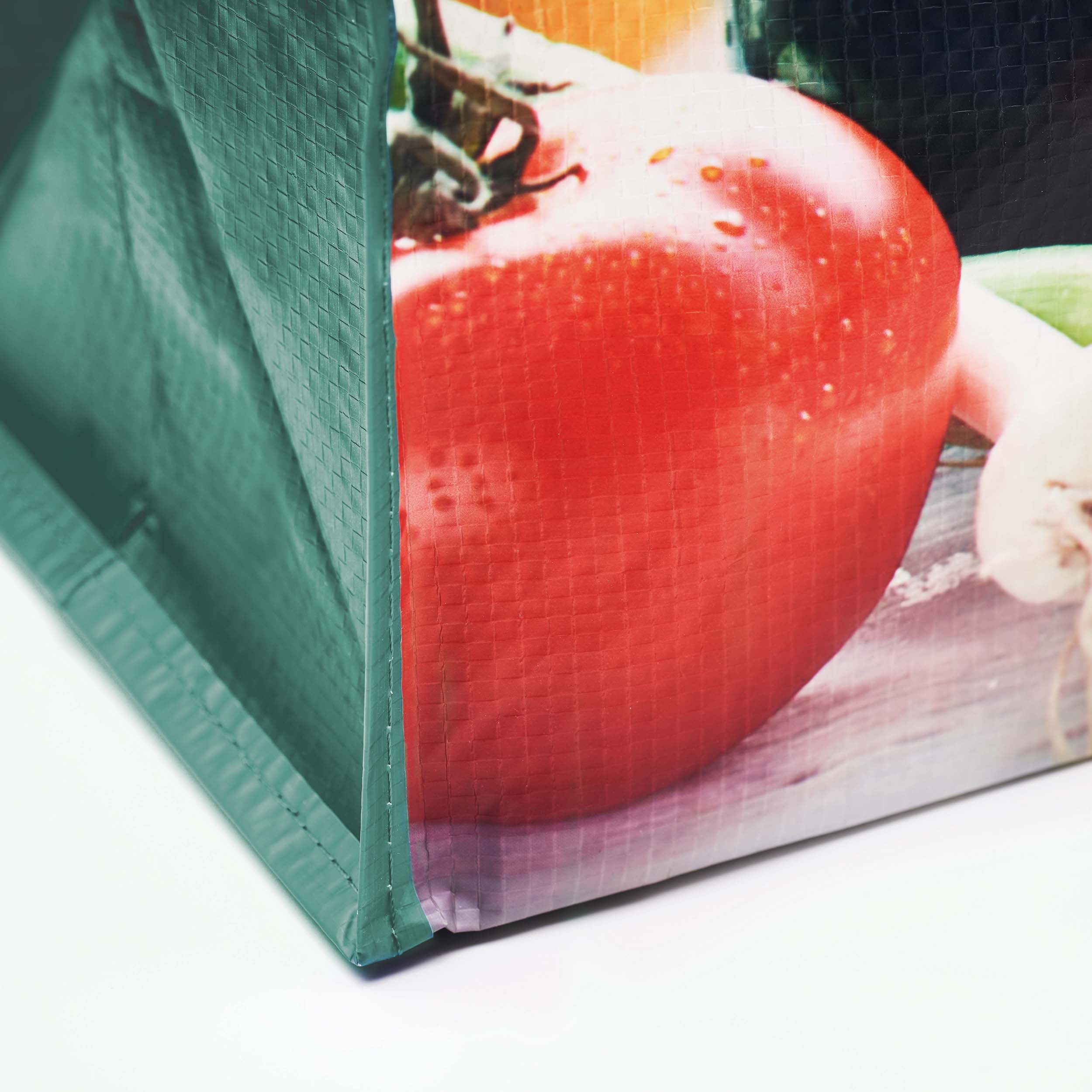 Horizontální nákupní taška s krátkými držadly z vlastního materiálu nebo PP popruhu (délka: 36 cm, šířka: 3 cm). Rozměry tašky: 45 x 40 x 20 cm. Základní materiál tašky je PP netkaná textilie 80 g/m2.