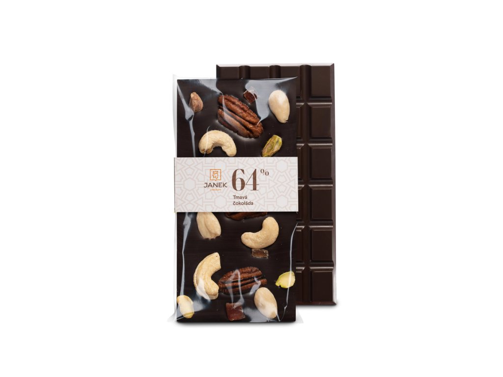 Tmavá čokoláda s 64% kakaové sušiny, výraznou hnědou barvou a intenzivní chutí. Obohacená o kešu, pekanové ořechy, mandle, pistácie a papáje – vše nesulfidované, pro dokonalou křupavost a čistou přírodní chuť. Poctivá česká výroba, bez lepku a palmového oleje. Pravá vanilka, žádné aroma. Každé sousto je zážitek. Složení: kakaová hmota (64%), kakaové máslo, cukr, emulgátor: sójový lecitin, kešu ořechy, mandle, pistácie, pekanové ořechy, sušená papája, aroma: přírodní vanilka. Váha: 95 g