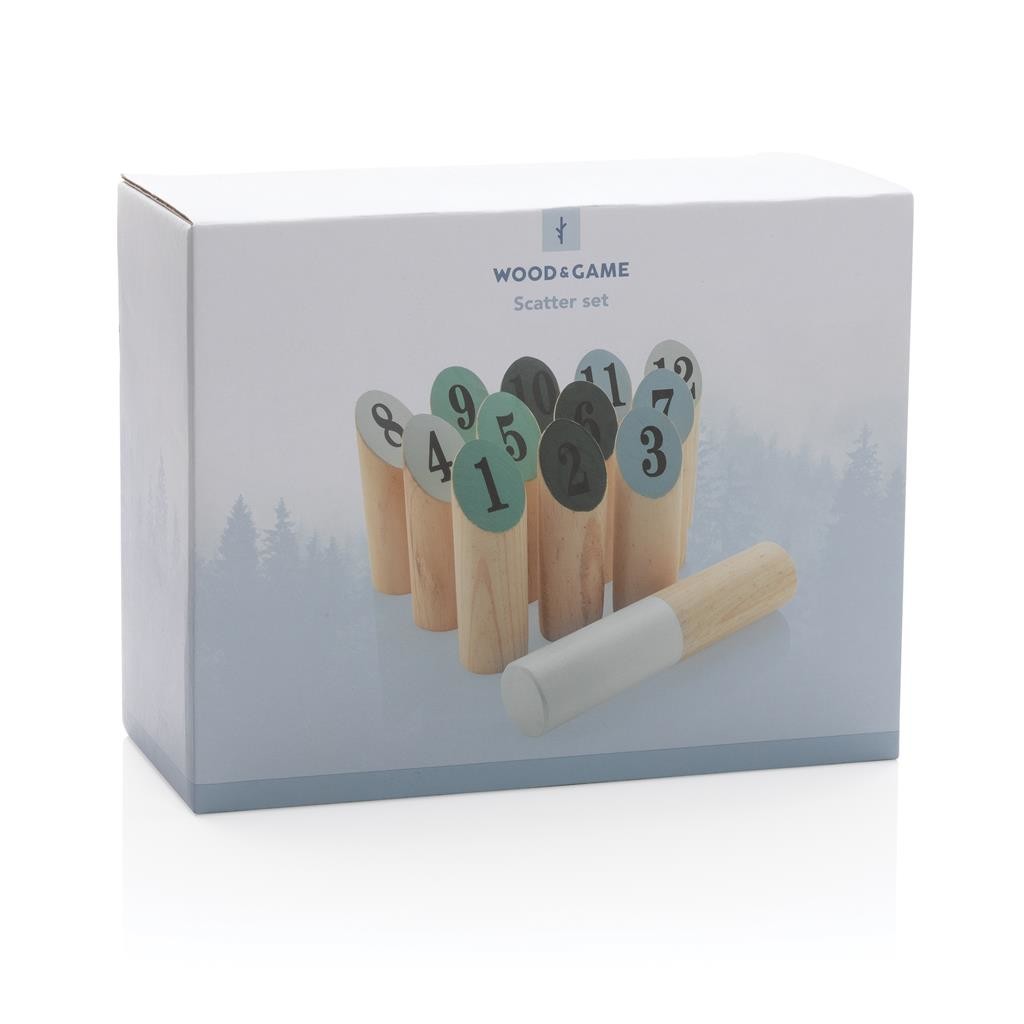 Návyková taktická hra Scatter. Cílem hry je hodem dřevěného polínka shodit čísly označené dřevěné kolíky. Hráč, který jako prví dosáhne přesně 50 bodů, vyhrává. 50 bodů nelze přesáhnout. Po každém hodu jsou kolíky postaveny do původní pozice. Sada obsauhuje 12 očíslovaných kolíků a 1 polínko. Celá je vyrobena z borovicového dřeva. Včetně bavlněného pytlíku a pravidel hry.