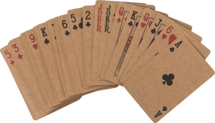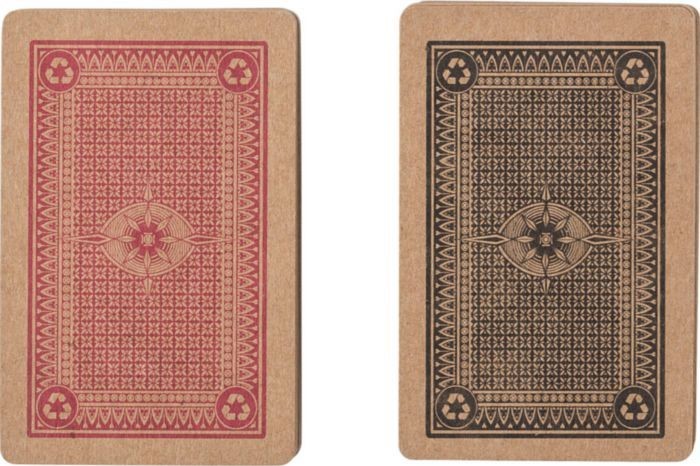 Sada dvou balíčků karet z recyklovaného kartonu. Každý balíček obsahuje 54 karet (52 karet + 2 žolíkové karty). Baleno po balíčku v kraftové papírové krabičce a zcela v pevné kraftové papírové krabici. Rozměry: 9,8 x 13,5 x 2,5 cm