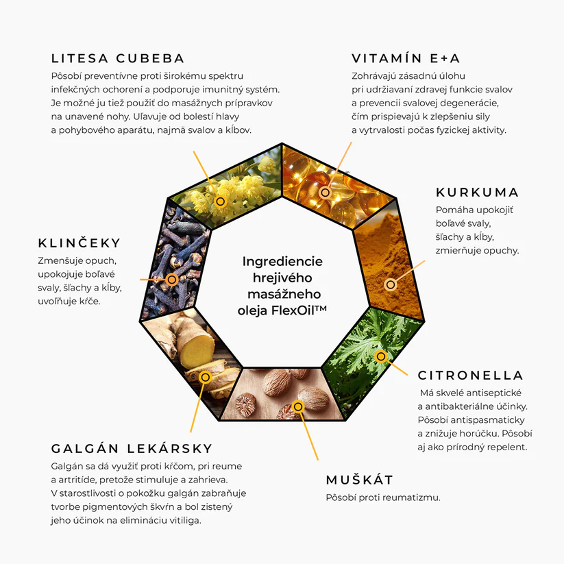 Hřejivý masážní olej FLEXOIL ™ obsahuje přírodní výtažky z litsey cubeby, hřebíčku, galganu, muškátu, kurkumy a citronelly, obohacené o vitamíny E + A. Uvolňuje svaly, snižuje otoky, působí proti křečím, revmatismu a podporuje prokrvení. Vhodný k regeneraci i přípravě svalů na zátěž.