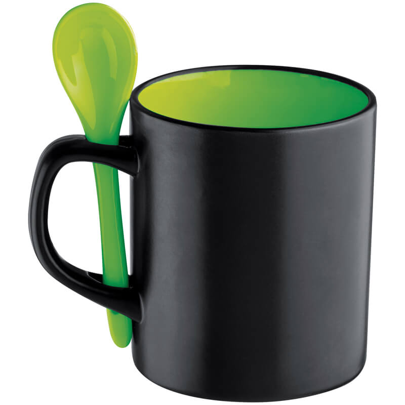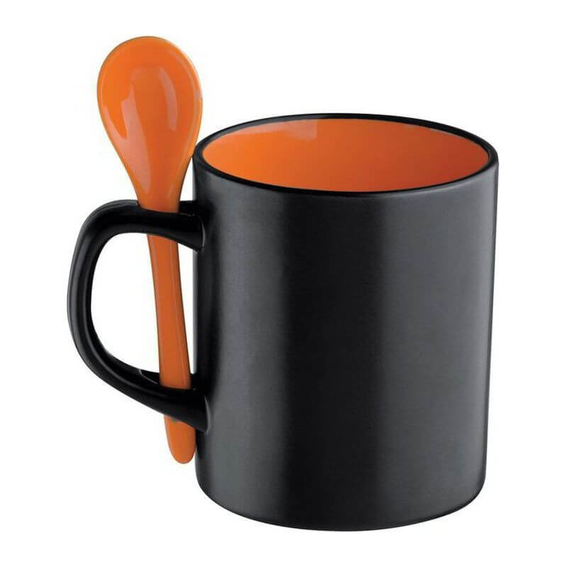 Porcelánový hrnek (300 ml) s malou lžičkou v elegantní černé barvě. Logo doporučujeme umístit výpalem.