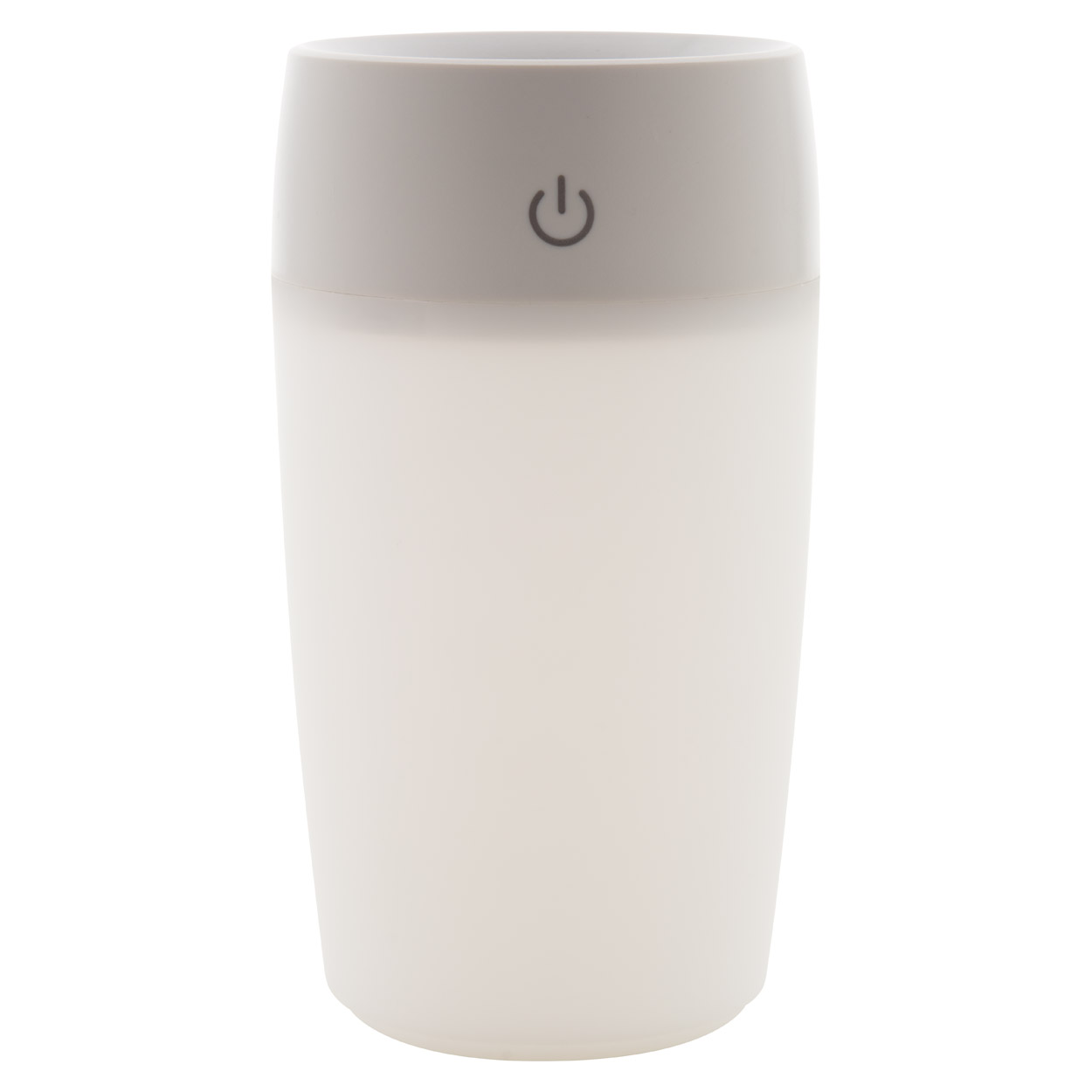 Plastový zvlhčovač vzduchu na stůl s modrým LED světlem a automatickým vypínáním. Vč. USB napájecího kabelu. Obsah nádržky 300 ml. V dárkové krabičce.