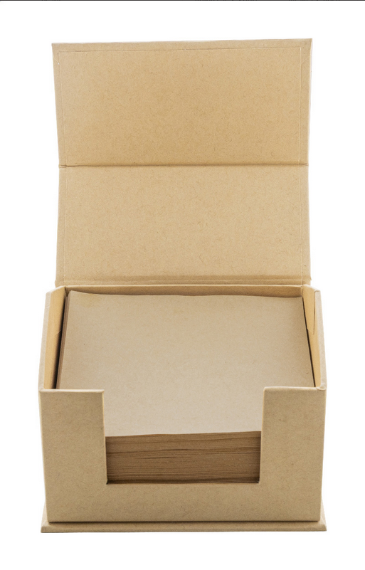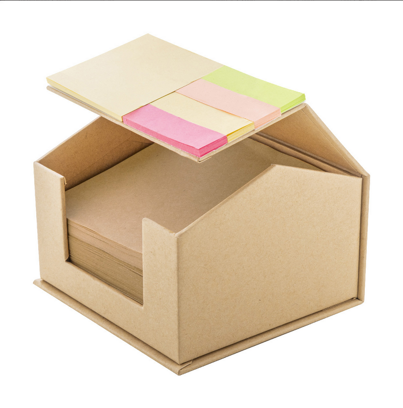 Dávkovač poznámkových blokov v tvare domčeka z recyklovaného kartónu s blokom na 300 listov z recyklovaného kraftového papiera. Vrátane 25 žltých samolepiacich papierikov a 100 značkovačov stránok (v 4 farbách) hore. New. Go Green