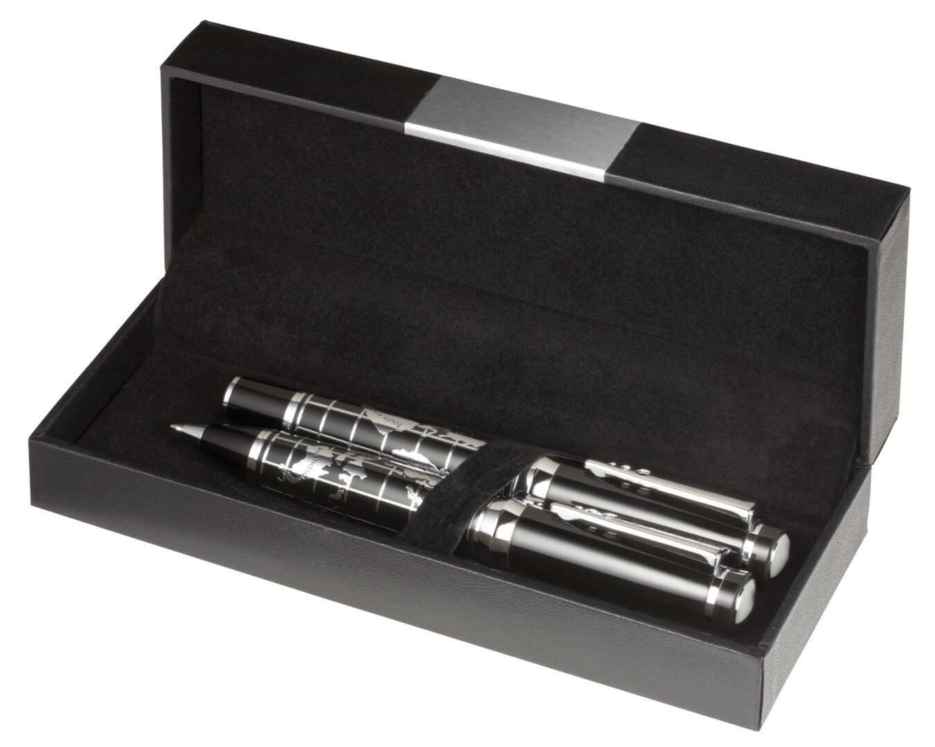 Sada per sestává z kovového roller s víčkem (černá barva) a kovový Otočný mechanizmus kuličkového pera (modré barvy), s designem mapy světa na hřídeli, klip v PiCOWORLD designu.