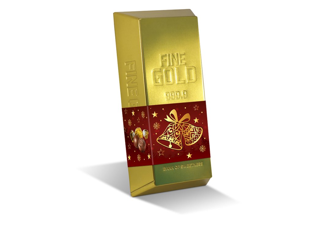 Plechová dóza ve tvaru zlaté cihličky ukrývá italské pralinky s krémovou lískooříškovou náplní – dárek s jiskrou.